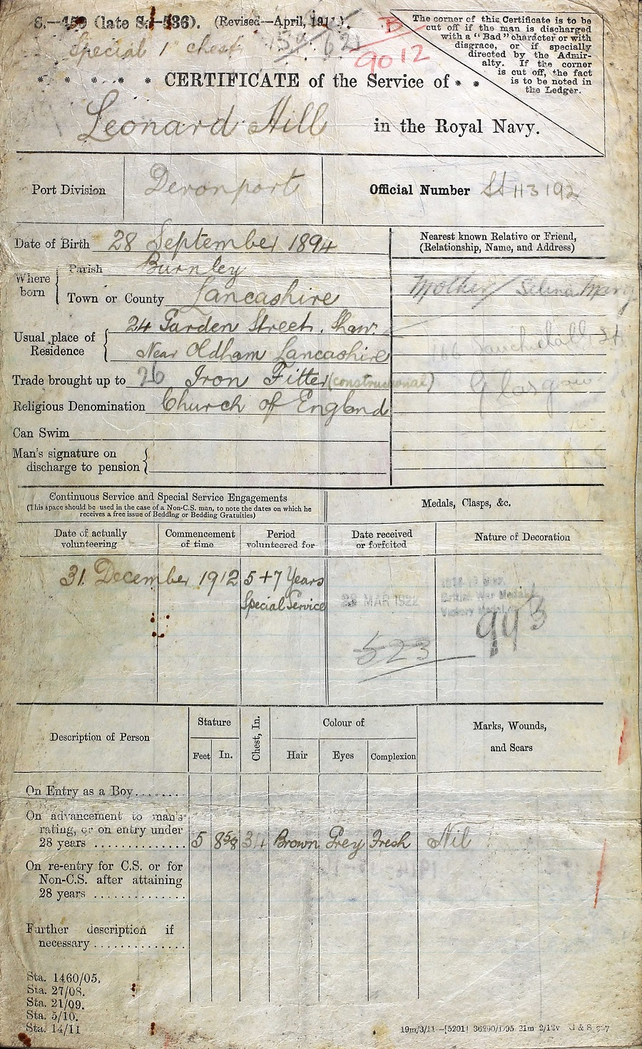 (1) Article on the death of Leonard Hill (2-3) RCNVR Service Summary (4-5) Royal Navy WW1 Certificate of Service