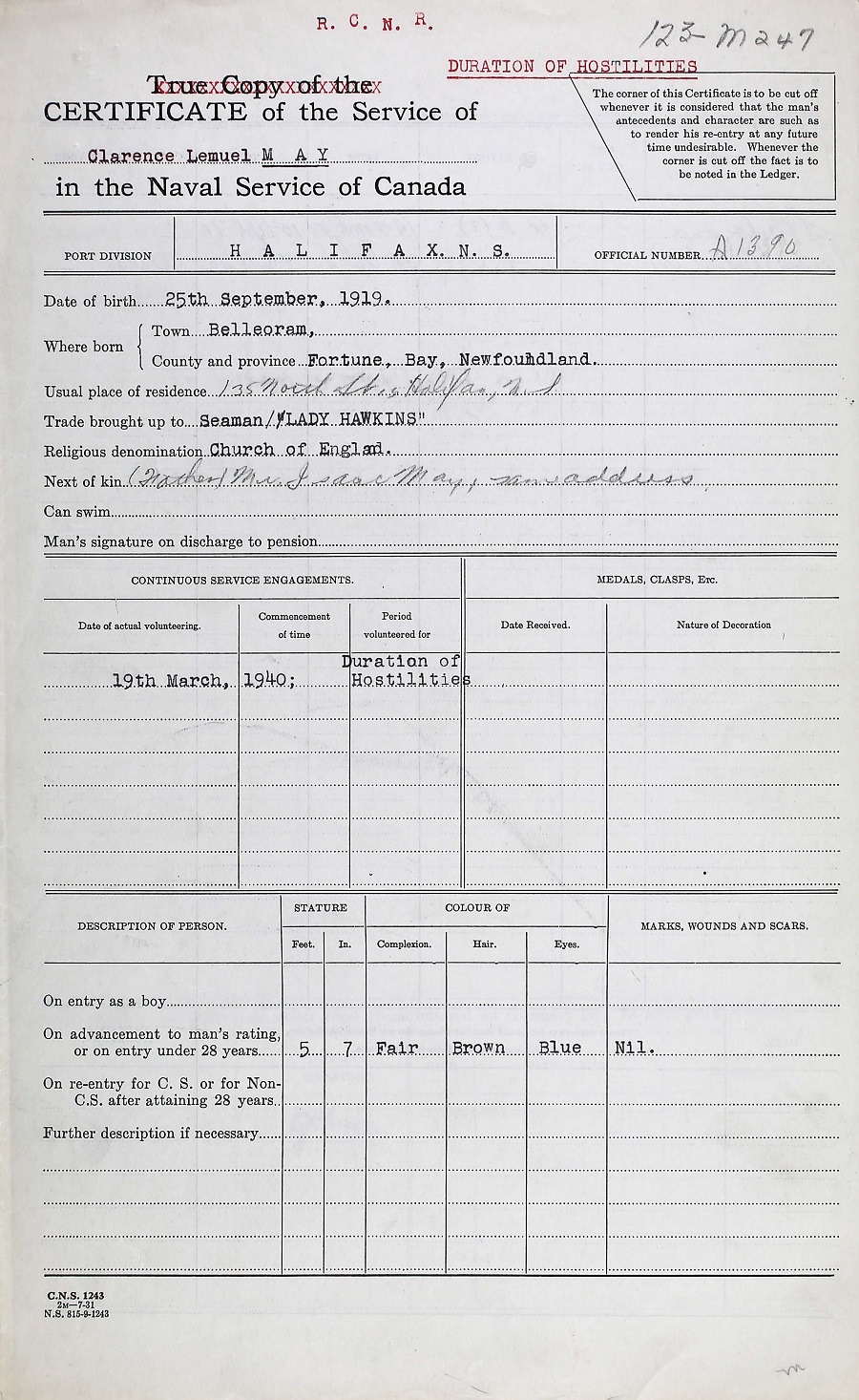 AB May joined the Canadian Navy on 1939 and was a seaman on Lady Hawkins before his enlistment.