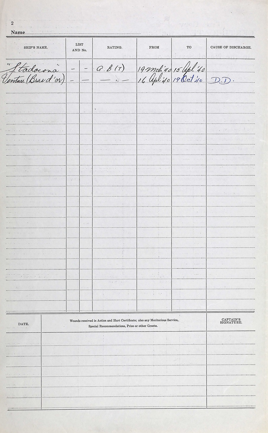 Ships served in: HMCS BRAS D'OR - Drafted to Bras D'Or 16 Apr 1940 as an AB, RCNR