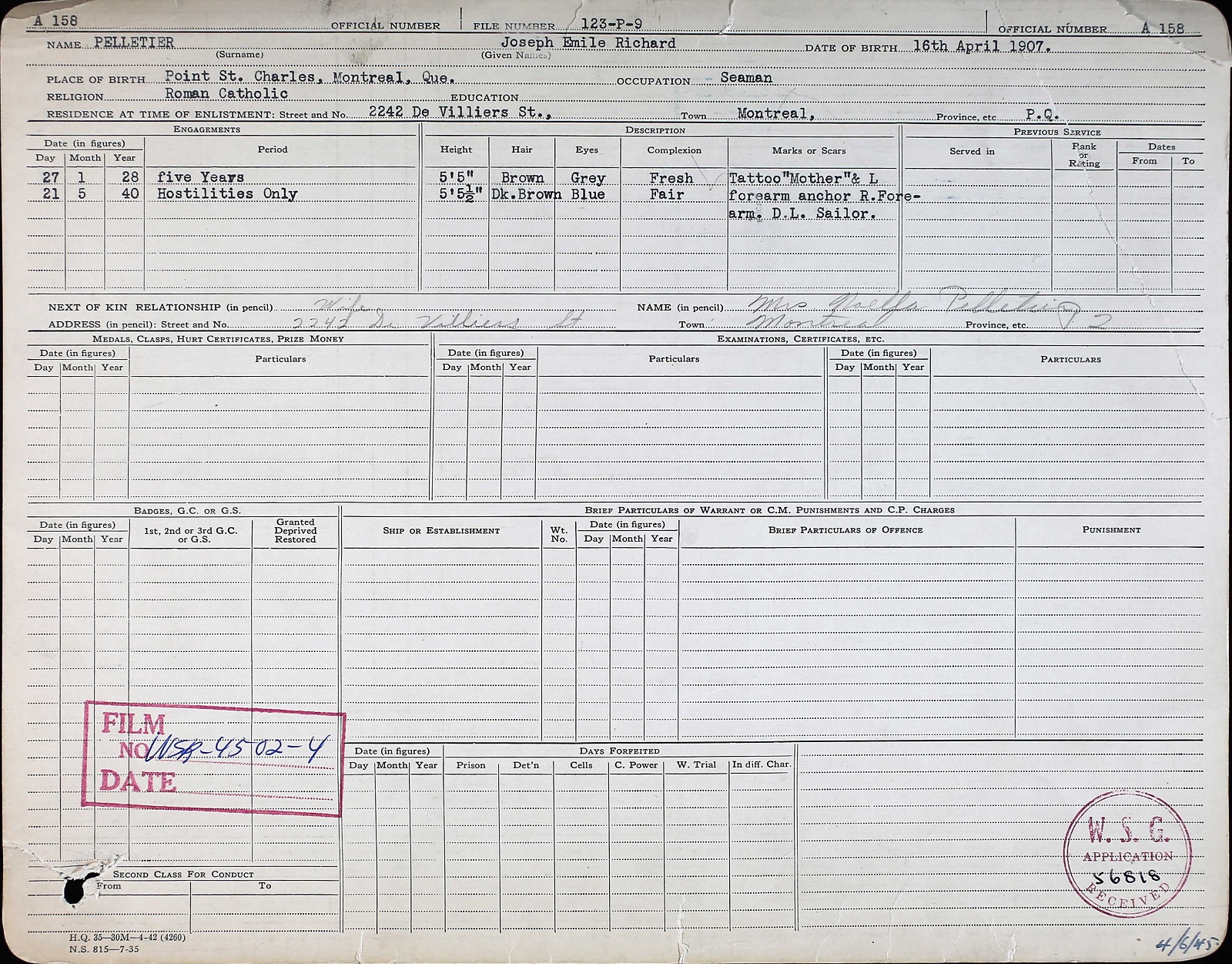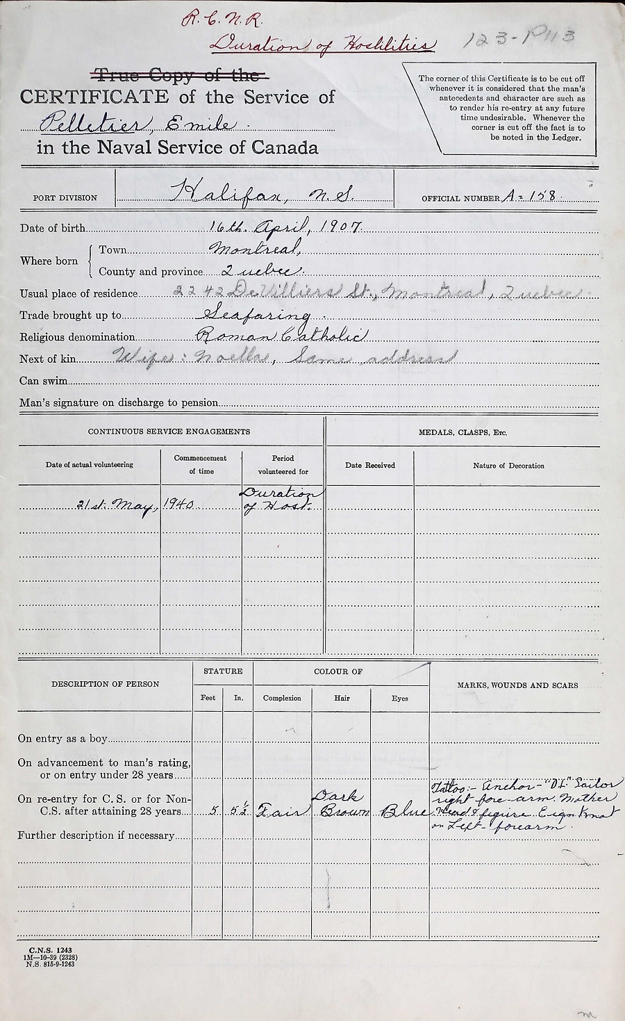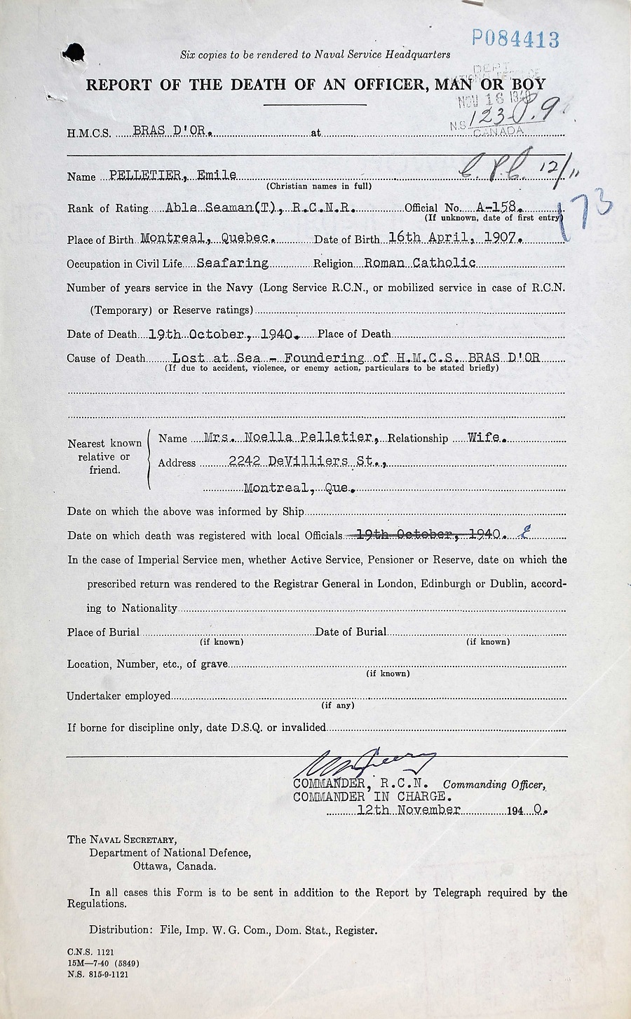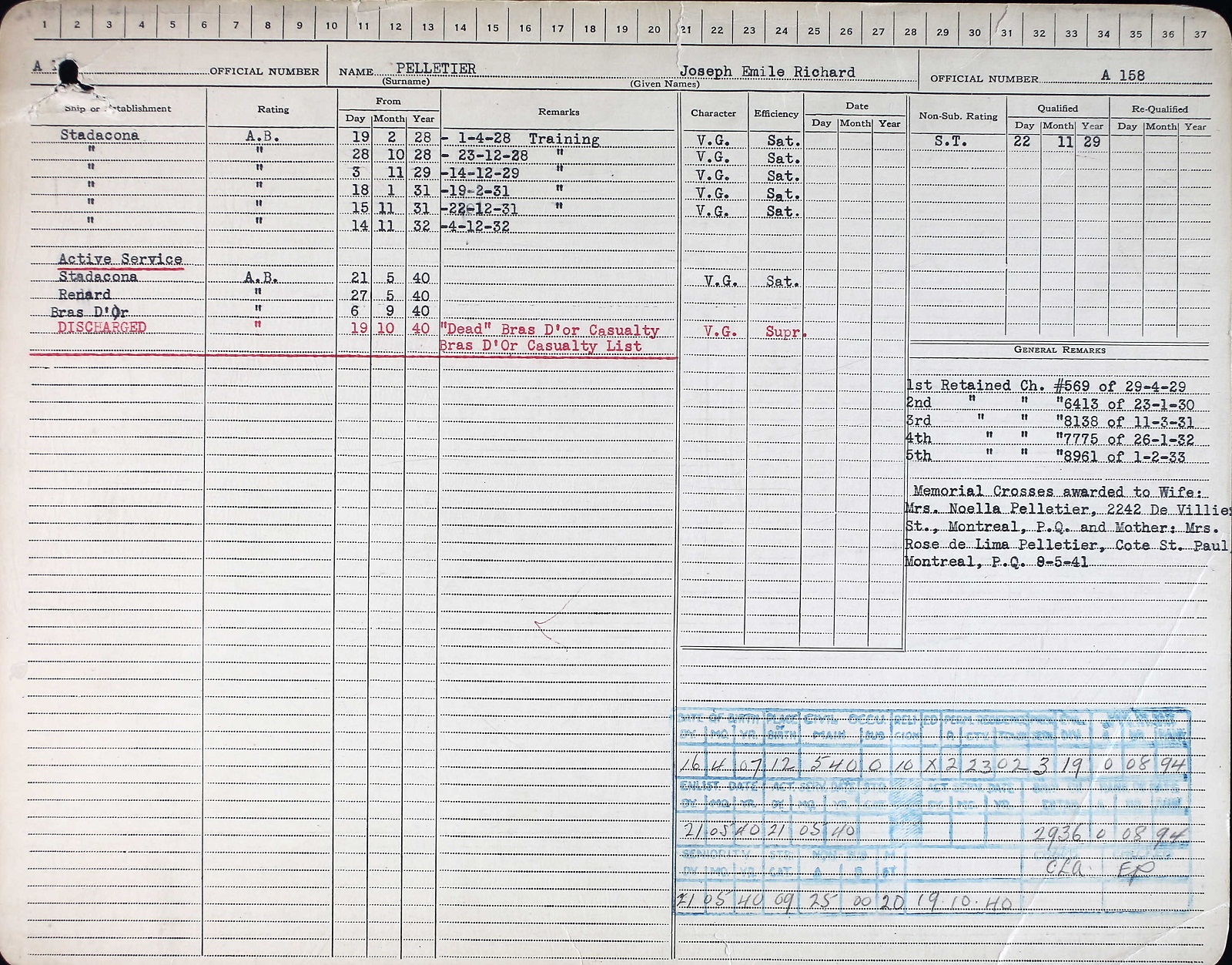 PELLETIER, Joseph Emile Richard, AB, A158, RCNR MPK - 19 Oct 1940, HMCS BRAS D'OR - son of Oscar and Rose Delima Pelletier; husband of Noella Pelletier, all of Montreal, QC.