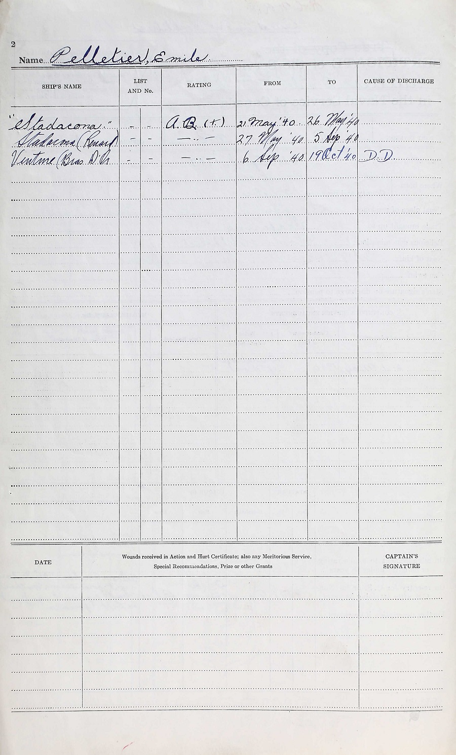 Ships served in: HMCS RENARD - Served in Renard 27 Apr 1940 - 05 Sep 1940 as an AB, RCNR HMCS BRAS D'OR - Drafted to Bras D'Or 06 Sep 1940 as an AB, RCNR