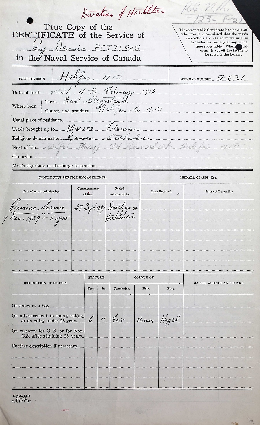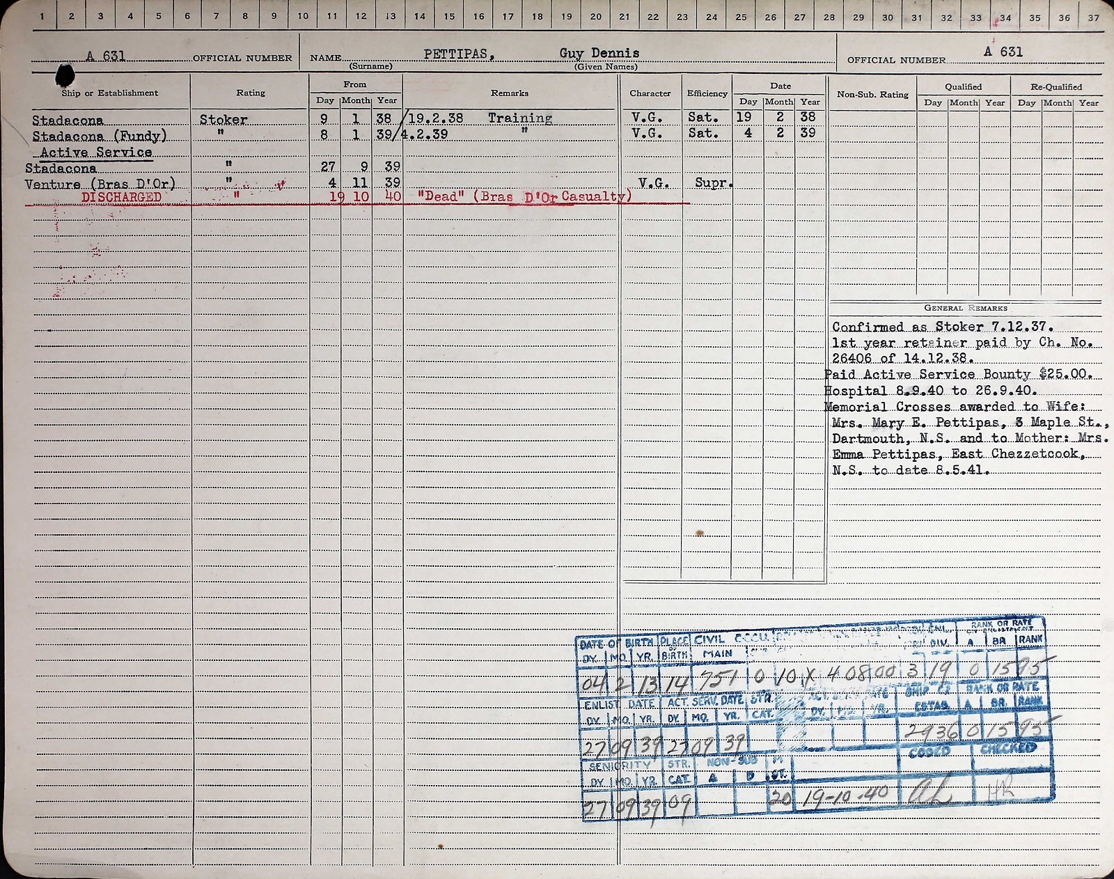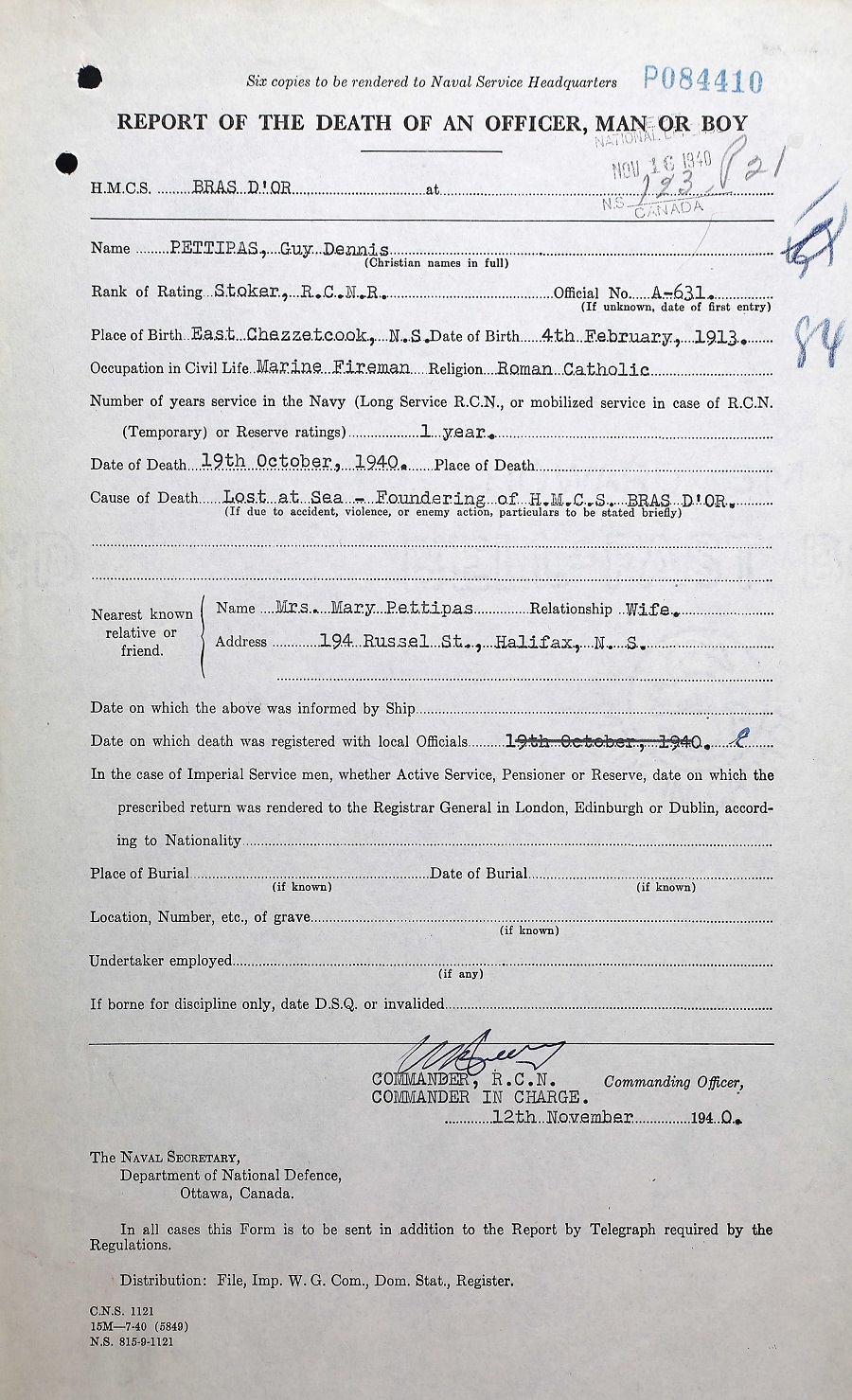 PETTIPAS, Guy Dennis, Sto, A631, RCNR, MPK - 19 Oct 1940, HMCS BRAS D'OR - son of Dennis Richard and Emma Lavinia Pettipas, of East Chezzetcook, NS; husband of Mary Edith Pettipas, of Eastern Passage, NS.