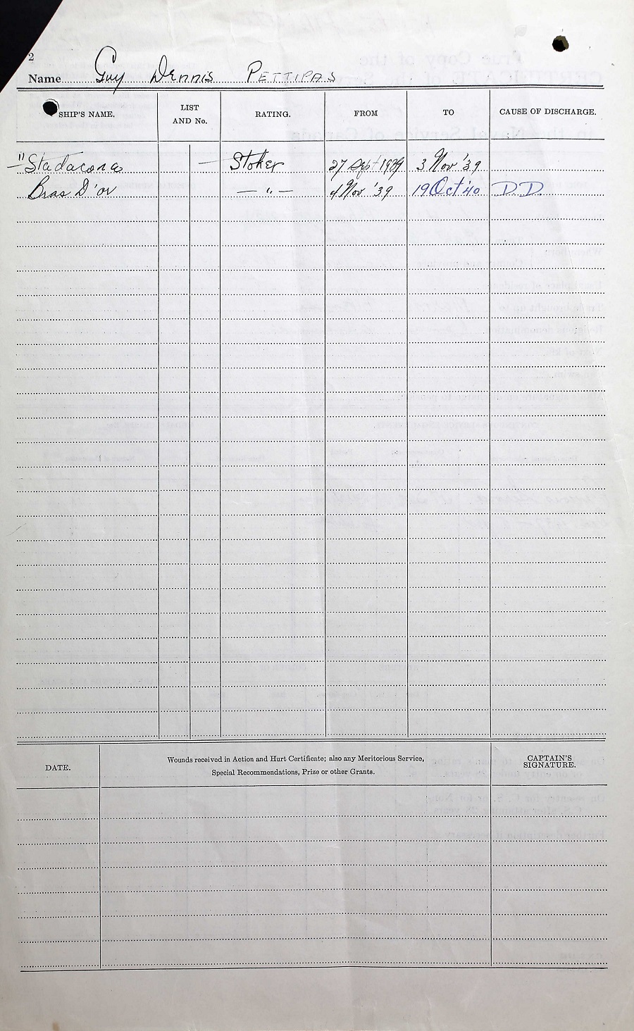 Ships served in: HMCS FUNDY - Served in FUNDY 08 Jan 1939 - 04 Feb 1939 (for training) as a Sto, RCNR HMCS BRAS D'OR - Drafted to BRAS D'OR 04 Nov 1939 as a Sto, RCNR