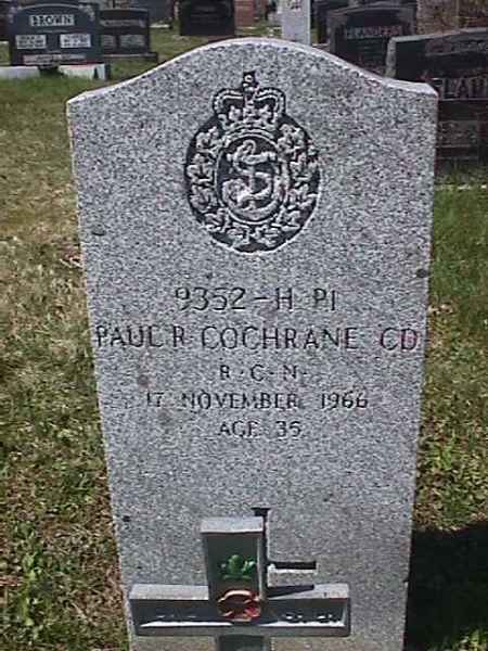COCHRANE, Paul Roger, Petty Officer - of St Croix, Hants County. He was stationed at Shearwater. Died suddenly due to an automobile accident in Sackville, Nova Scotia November 17, 1966 age 35. The remains are resting at the H. D. Lindsay Funeral Home, Windsor funeral service will be held with full military honors from the St. Croix United Church on Sunday at 2 p.m. with Rev. Brian Gee officiating. (Halifax Chronicle-Herald 19 Nov 1966. Researched by / courtesy of George Newbury)