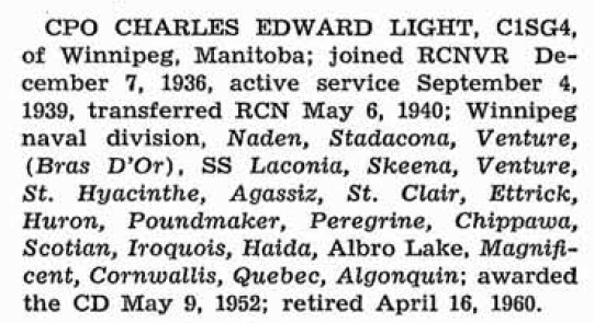 LIGHT, Charles Edward (Ted) - 74, Clementsport, Annapolis County, died August 10, 1994, at home. Born in Winnipeg, Man., he was a son of the late Charles P. and Eva Light. He served in the Royal Canadian Navy from 1939-59, retiring as Chief Petty Officer 1st class, communicator. He served on H.M.C. ships, NADEN, STADACONA, VENTURE, BRAS D'OR, LACONIA, SKEENA, ST HYACINTHE, AGASSIZ, ST CLAIR, ETTRICK, HURON, POUNDMAKER, PEREGRINE, CHIPPAWA, SCOTIAN, IROQUOIS, HAIDA, ALBRO LAKE, MAGNIFICENT, QUEBEC, ALGONQUIN and CORNWALLIS. From 1960-79, he was employed with the Department of National Defense, CFB Cornwallis as a managerial teletype communicator. Upon retirement, he received the Government of Canada Long Service Medal. He worked many years with the Cornwallis Sea Cadets, serving as OC for two years. He was a member of the Atlantic Chiefs and Petty Officers Association and the Navy League of Canada. During his life, he operated a beef farm in Clementsport and was a member of Digby County Department of Agriculture. He is survived by his wife, the former Marion White; two daughters; Joanne Light, Dartmouth; Lorraine Brenton, Halifax; two granddaughters; sister, Margaret Johansen, Edmonton. He was predeceased by a sister, Mary. A memorial service will be 4 p.m. Saturday in Robert L. Hall Funeral Home, Annapolis Royal, Rev. Harold Kay officiating. Family flowers only. Donations may be made to Parkinsons Foundation of Canada, Nova Scotia Division or any charity. (Halifax Chronicle-Herald Thursday, 12 Aug 1994) (Researched by / Courtesy of George Newbury)