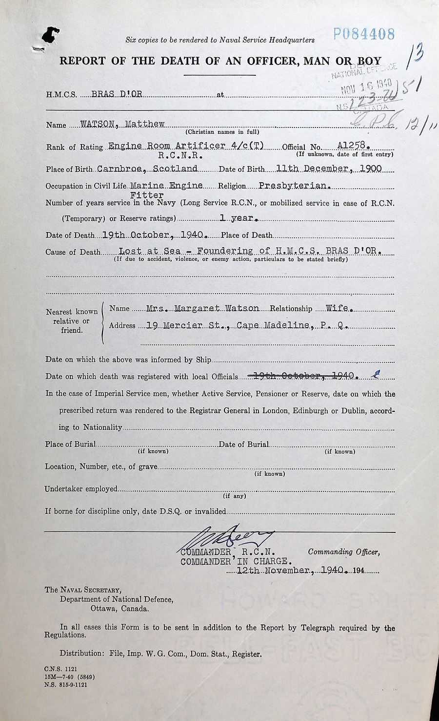 WATSON, Matthew, ERA 4c, A1258, RCNR, MPK - 19 Oct 1940, HMCS BRAS D'OR - Born 11 Dec 1900, son of Thomas and Mary D. Watson; husband of Margaret Watson, of Three Rivers, QC.