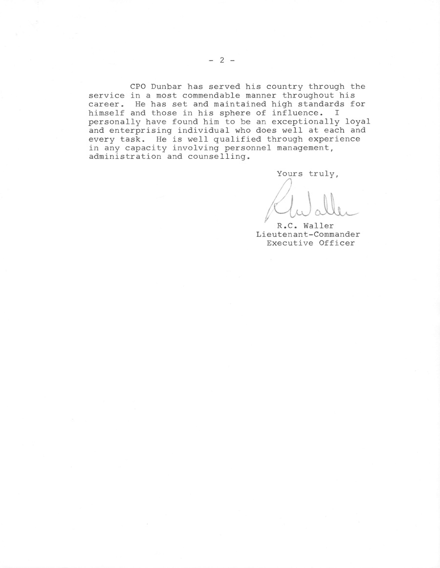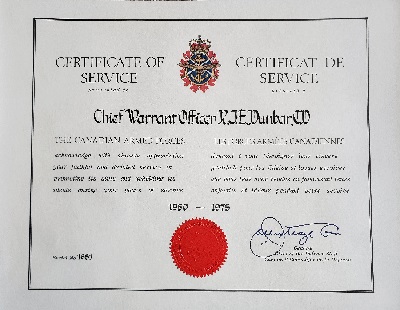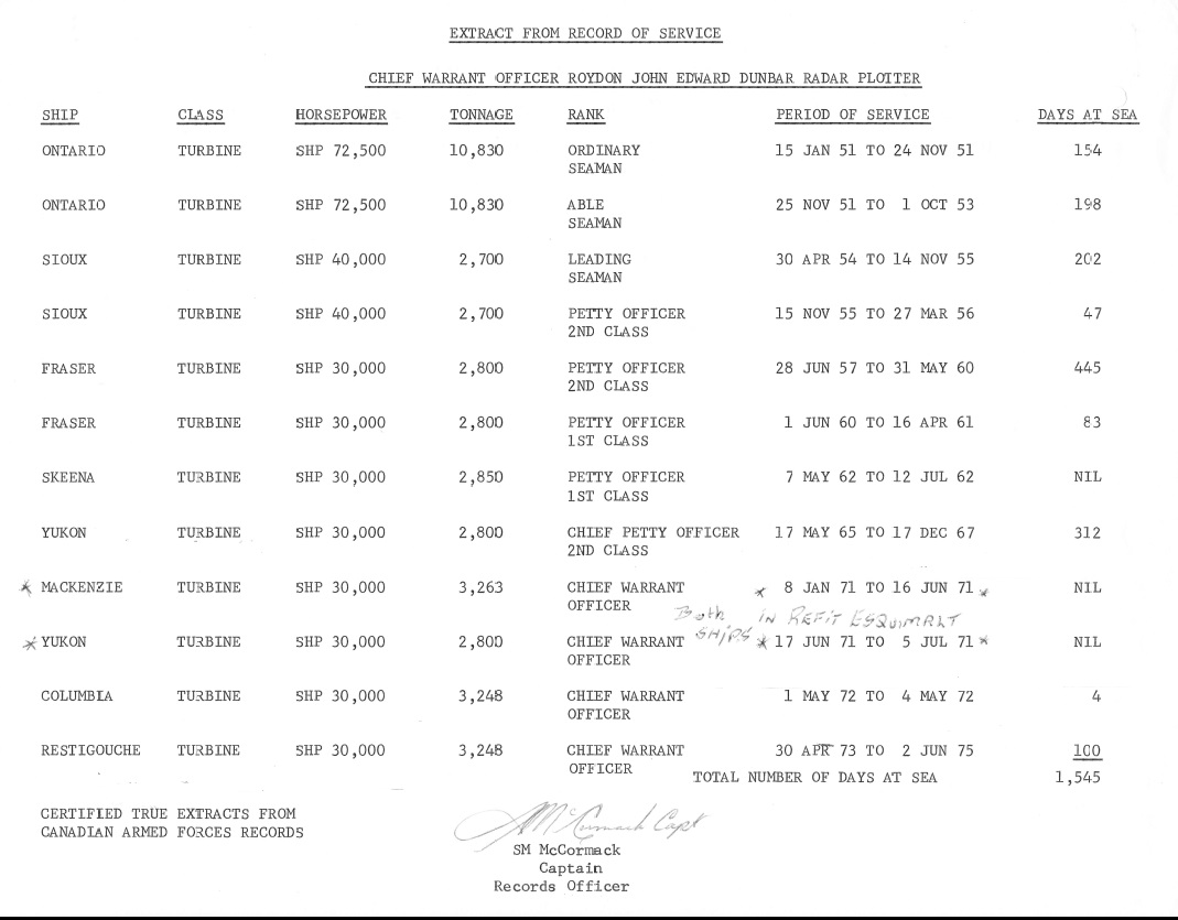 Ships served in: HMCS ONTARIO - Served in Ontario 15 Jan 1951 - 01 Oct 1953 as an OS and AB, RCN. Rated AB 25 Nov 1951 HMCS SIOUX - Served in Sioux 30 Apr 1954 - 27 Mar 1956 as a LS and PO2, RCN. Rated PO2 15 Nov 1955 HMCS FRASER - Served in Fraser 28 Jun 1957 - 16 Apr 1961 as a PO2 and PO1, RCN. Rated PO1 01 Jun 1960 HMCS SKEENA - Served in Skeena 07 May 1962 - 12 Jul 1962 as a PO1, RCN HMCS YUKON - Served in Yukon 17 May 1965 - 17 Dec 1967 as a CPO2, RCN, I/C Radar Branch HMCS MACKENZIE - Served in Mackenzie 08 Jan 1971 - 16 Jun 1971 as a CPO1, C.A.F. (in refit) HMCS YUKON - Served in Yukon 17 Jun 1971 - 05 Jul 1971 as a CPO1, C.A.F. (in refit) HMCS COLUMBIA - Served in Columbia 01 May 1972 - 04 May 1972 as a CPO1, C.A.F. HMCS RESTIGOUCHE - Served in Restigouche 30 Apr 1973 - 02 Jun 1975 as CPO1, C.A.F., Cox'n