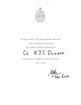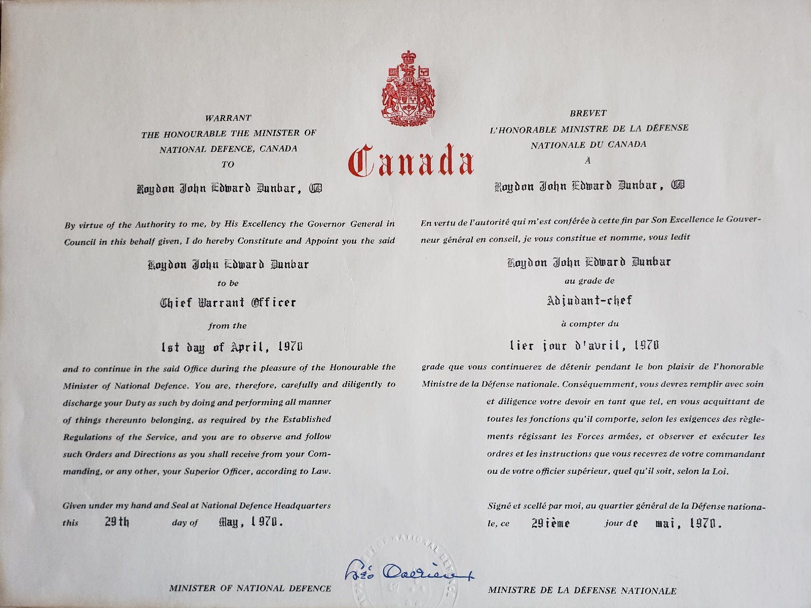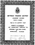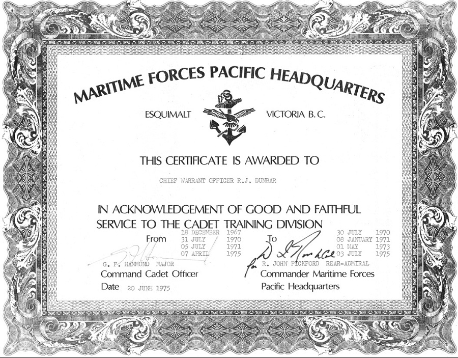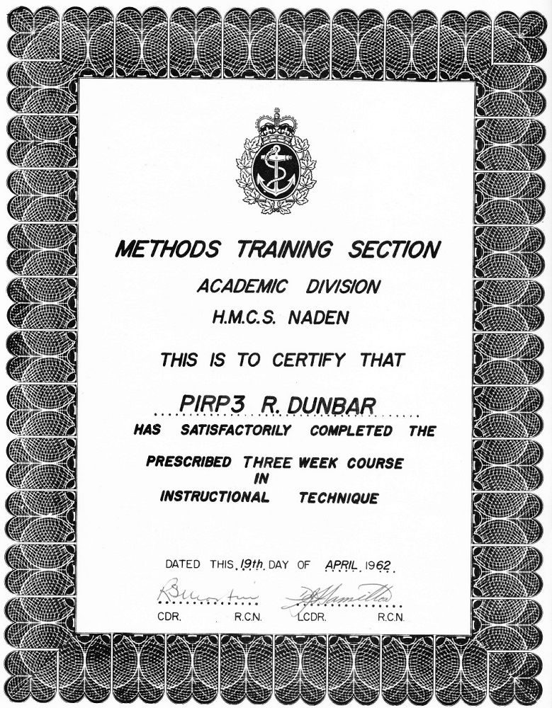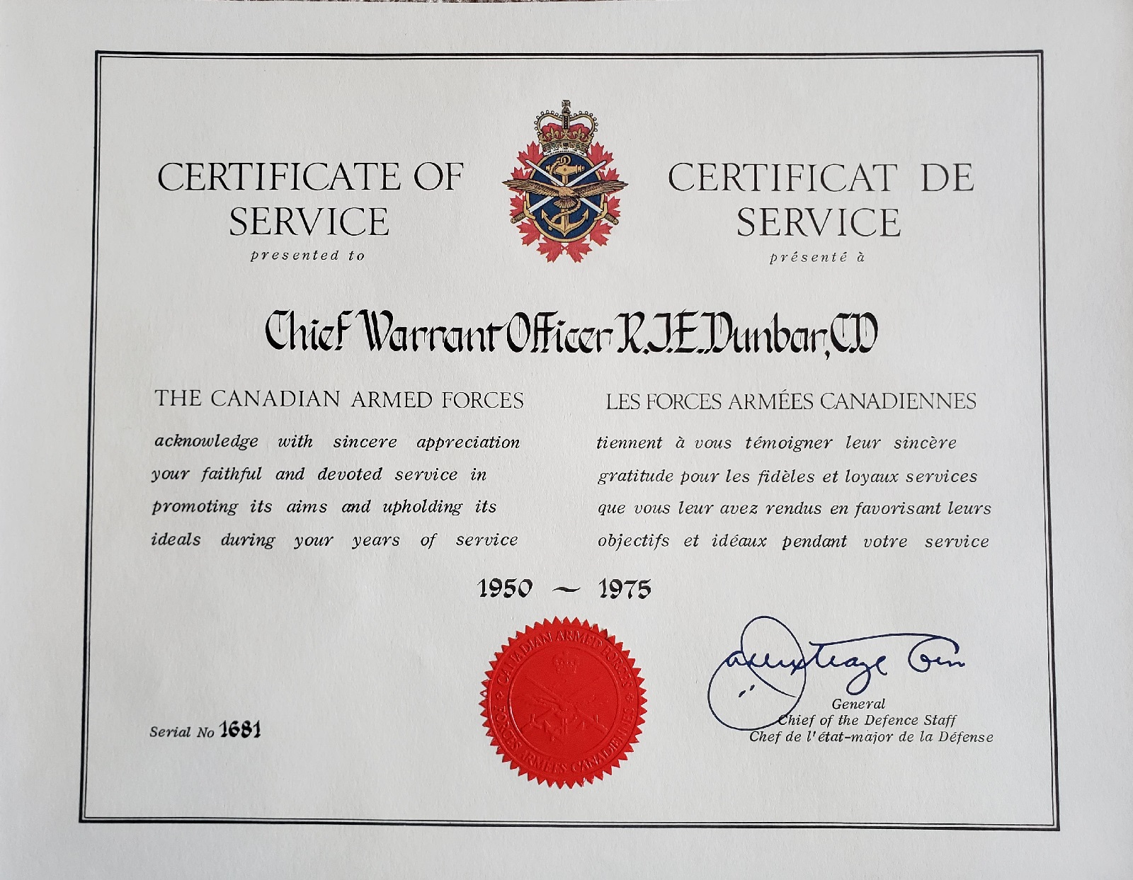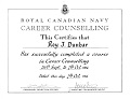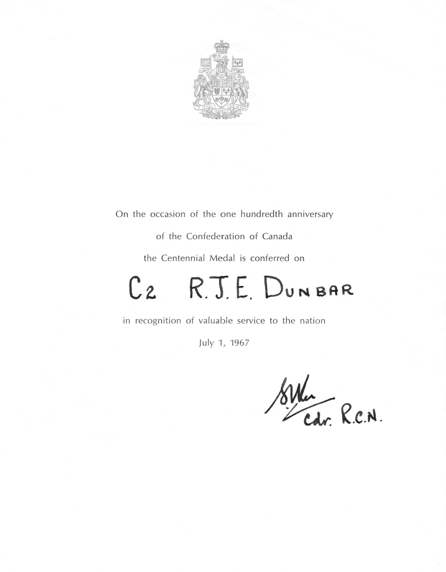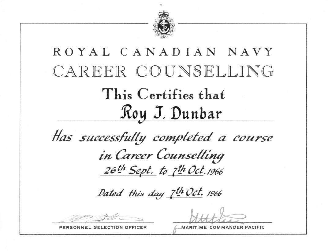 (RD01) OS Roy Dunbar at HMCS CORNWALLIS - Aug 1950 - Jan 1951 (RD02) Extract from service records (RD03) Award of the Canadian Centennial Medal (RD04) Certificate of Appreciation from Cadet Training Division (RD05) Certificate of Achievement - Career Counselling Course