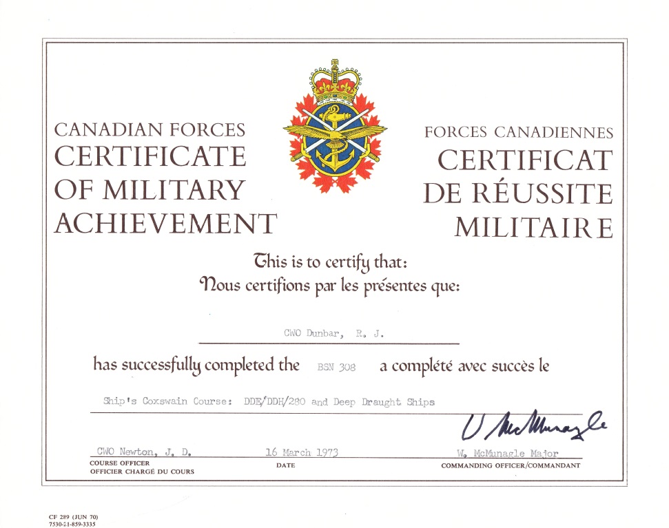 (RD06) Certificate of Achievement - Radar Plotter Trade Group 4 course (RD07) Certificate of Achievement - Instructional Techniques course (RD08) Certificate of Achievement - Ship's Coxswain Course (RD09-RD10) Letter of Recommendation