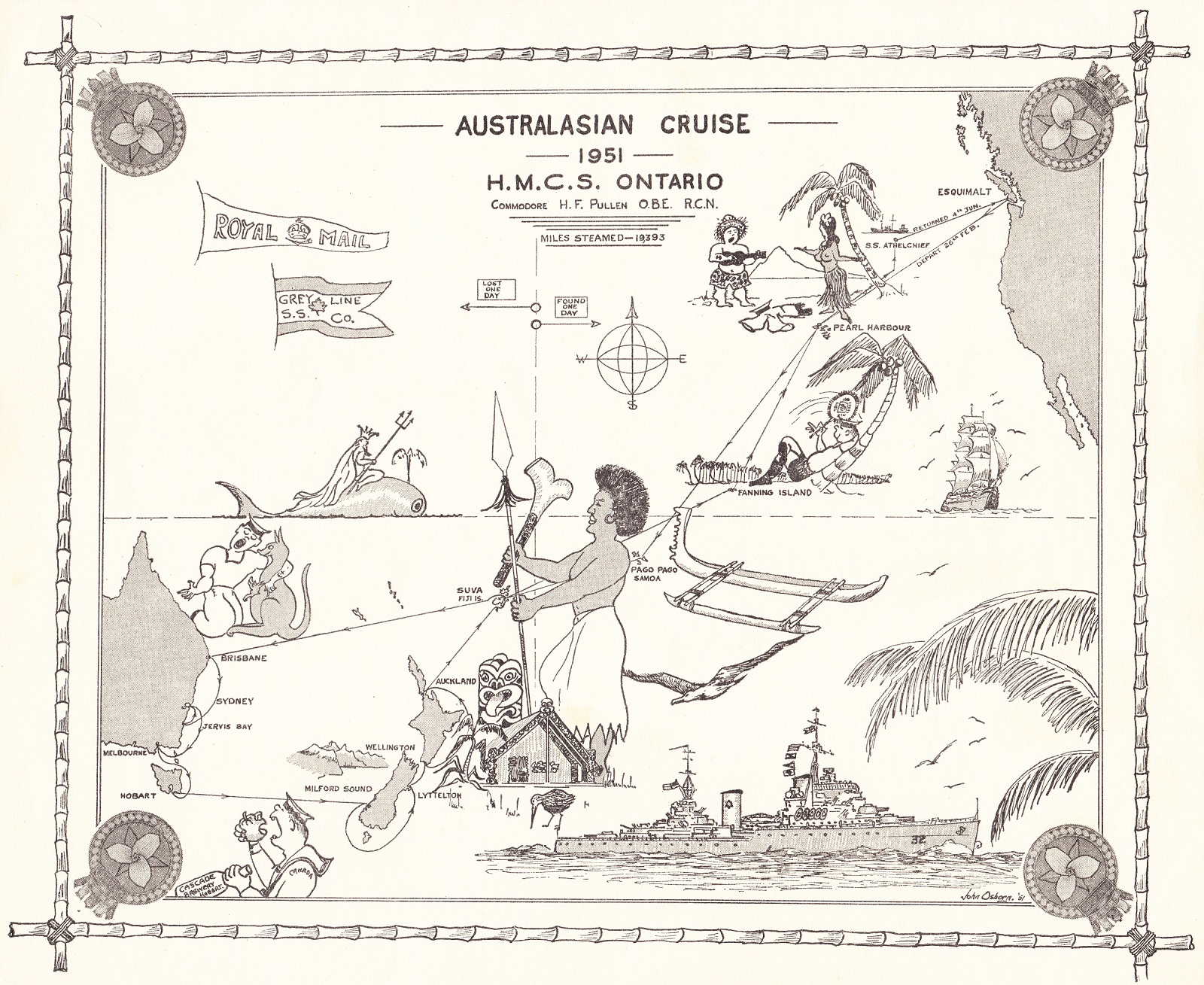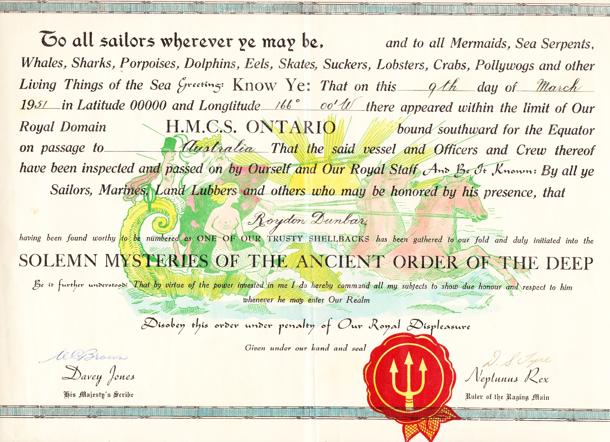 (RD11) Articles on the commissioning of HMCS FRASER (RD12) HMCS ONTARIO - 1951 (RD13) HMCS ONTARIO in drydock in Esquimalt, BC (RD14) Certificate / Memento - HMCS ONTARIO 1951 Pacific Cruise (RD15) Roy Dunbar's Crossing the Line (Equator) certificate onboard HMCS ONTARIO 09 Mar 1951