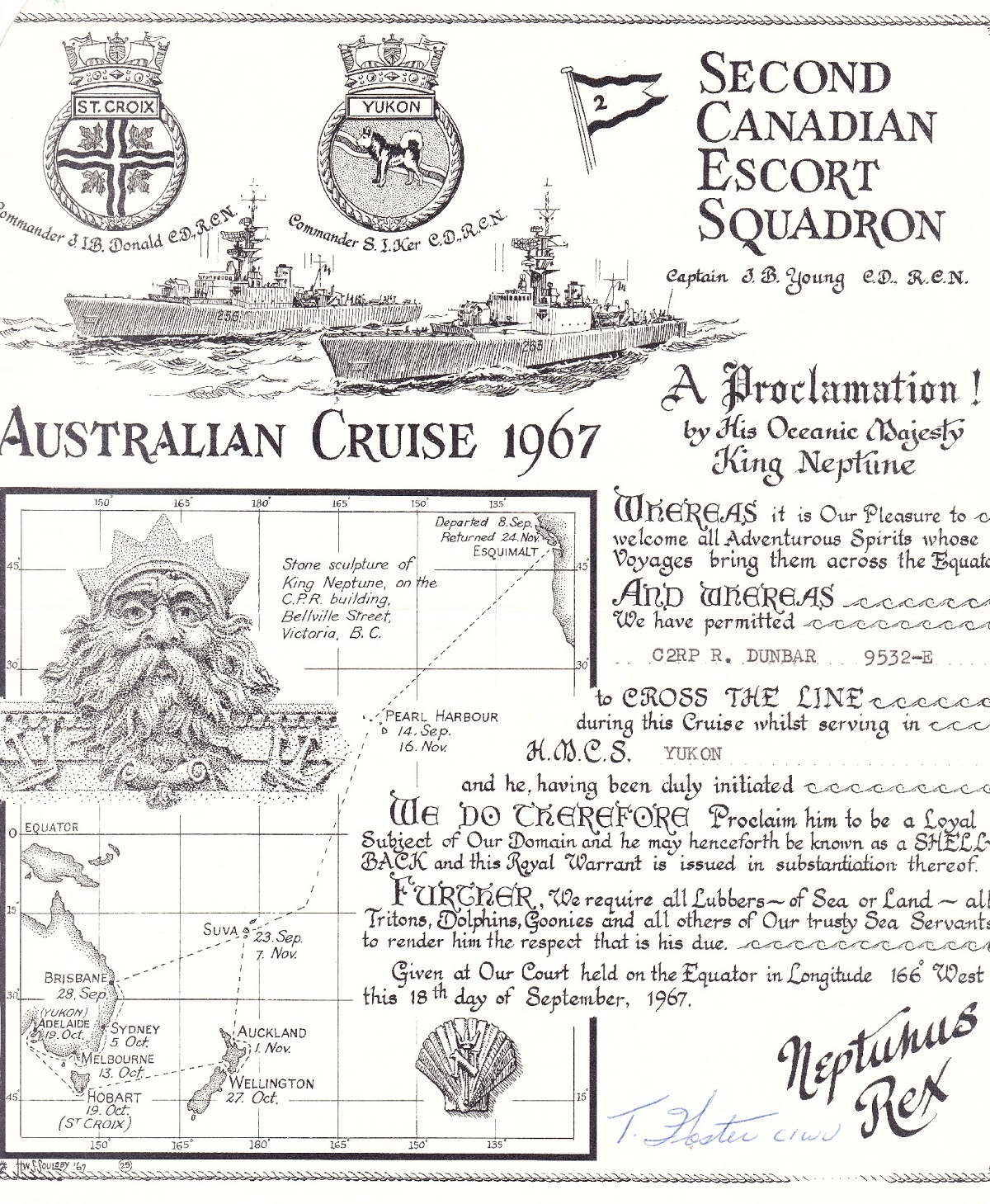 (RD16) Crossing the Line (Equator) certificate onboard HMCS YUKON 18 Sep 1967 (RD17) Newspaper articles for HMCS SIOUX's departure and return from Victoria, BC for her 3rd Korean War tour from 07 NOV 1954 to 24 Sep 1955 (RD18) HMCS SIOUX's route of travel for her 3rd Korean War tour