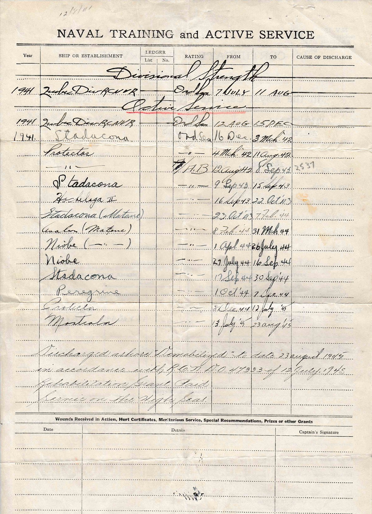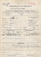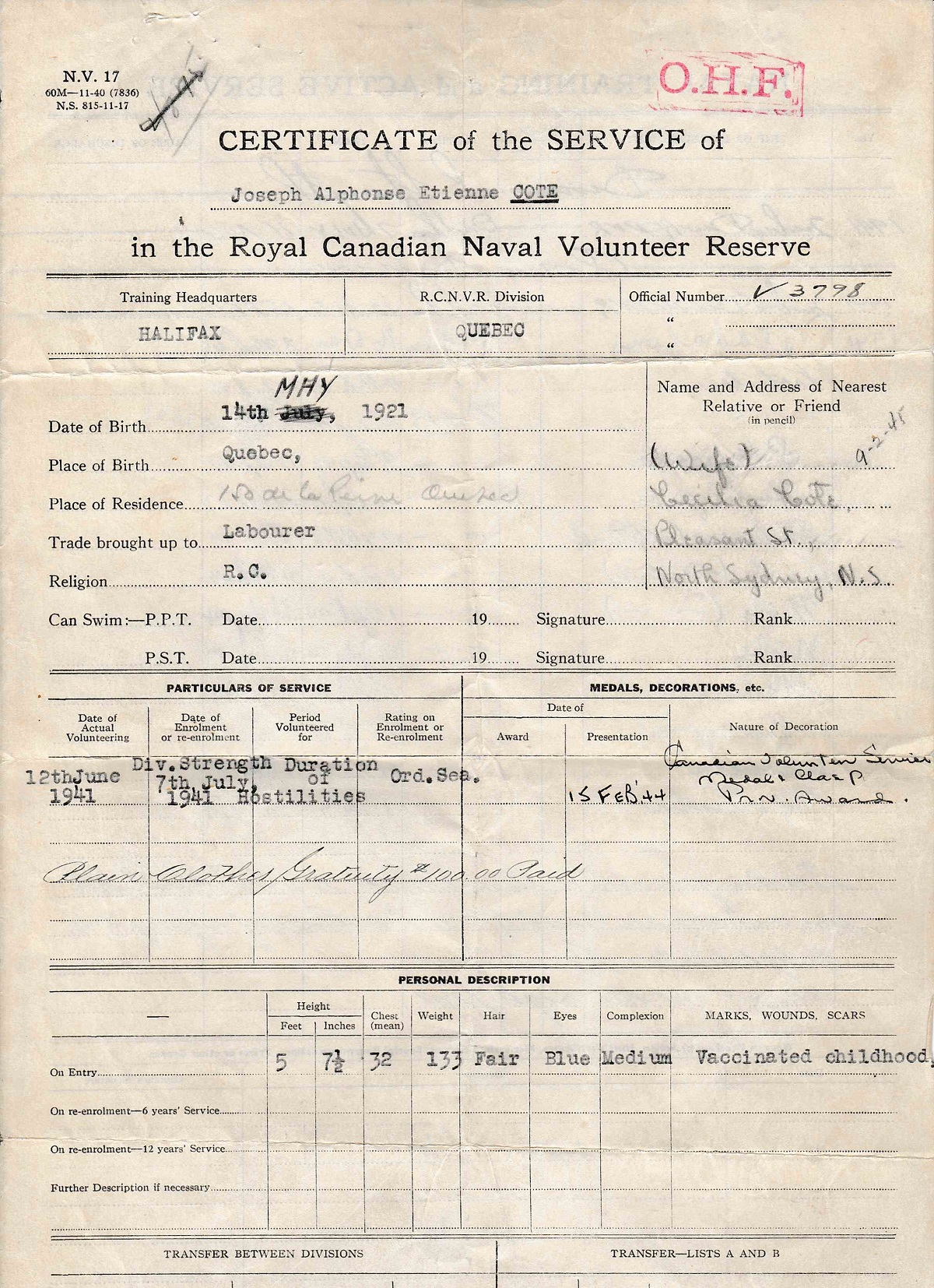 Ships served in: QUEBEC DIVISION RCNVR - Enlisted 07 Jul 1941. Commenced Active Service 12 Aug 1941 HMCS MATANE - Served in MATANE 23 Oct 1943 - 26 Jul 1944 HMCS MONTCALM - Served in MONTCALM 13 Jul 1945 - 23 Aug 1945. Demobilized 23 Aug 1945