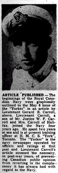 Article on Lt G.R. Carroll publishing articles in the "Yorker" The Halifax Mail 26 May 1944 Researched by / Courtesy of George Newbury