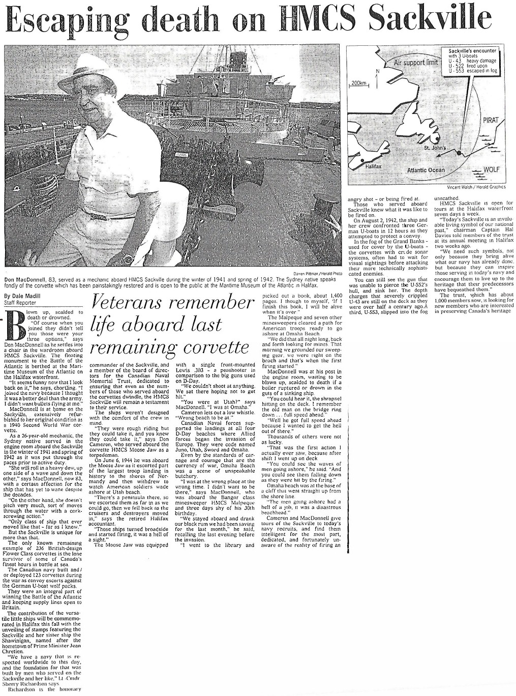 Donald MacDonnell tells of his time on HMCS Sackville during WW2 Article from the Halifax Herald 02 Aug 1998 Courtesy of Margaret Gillis