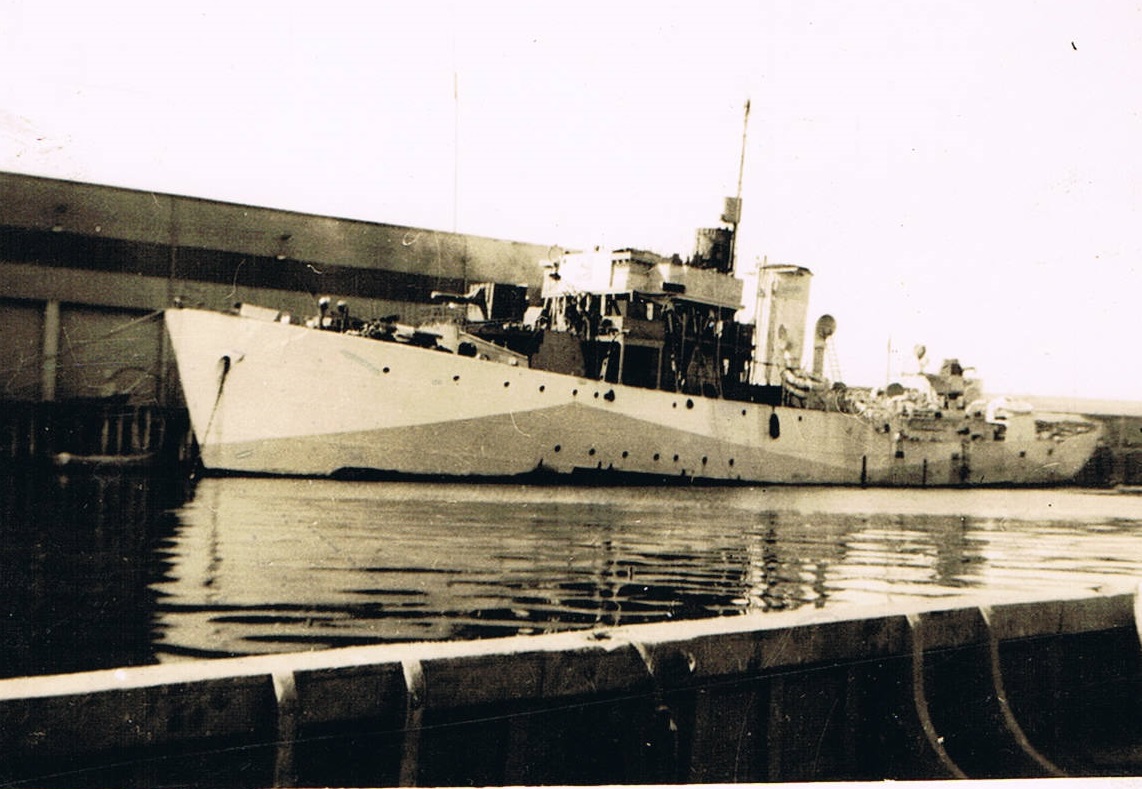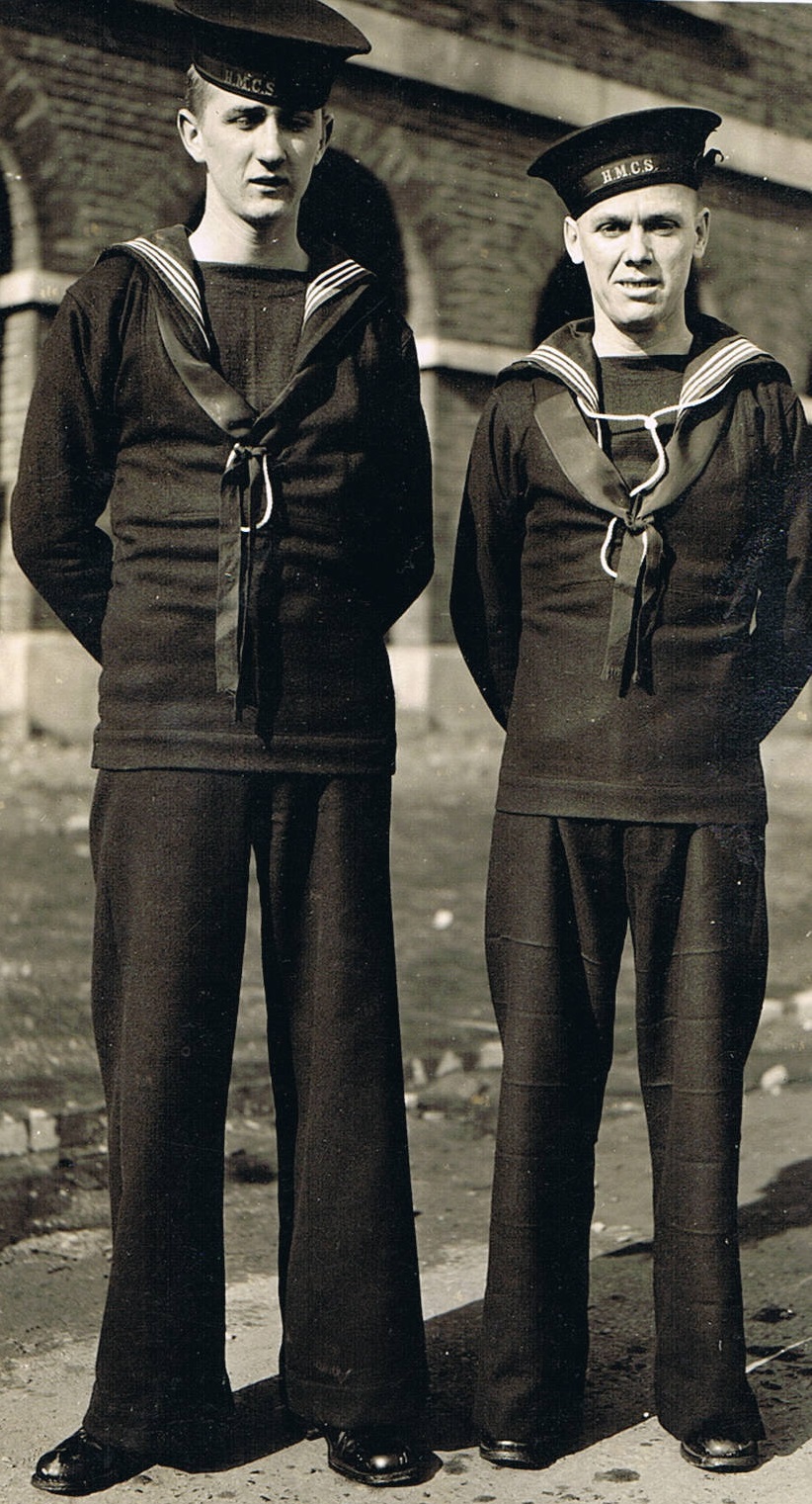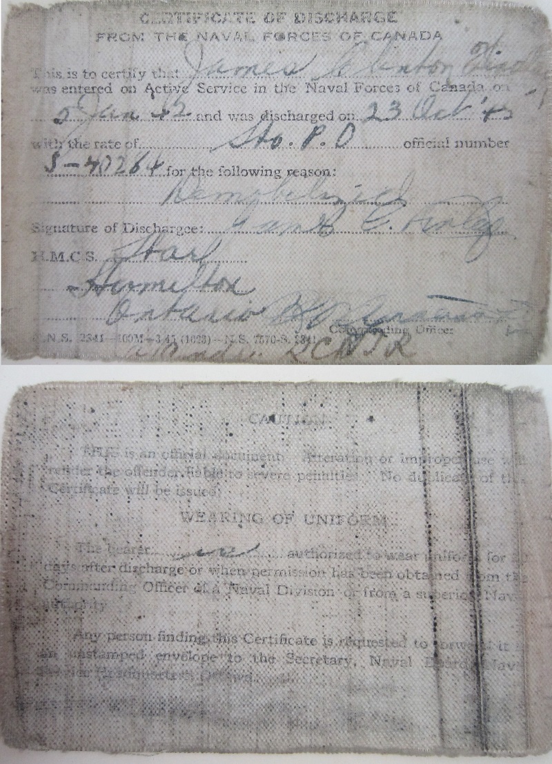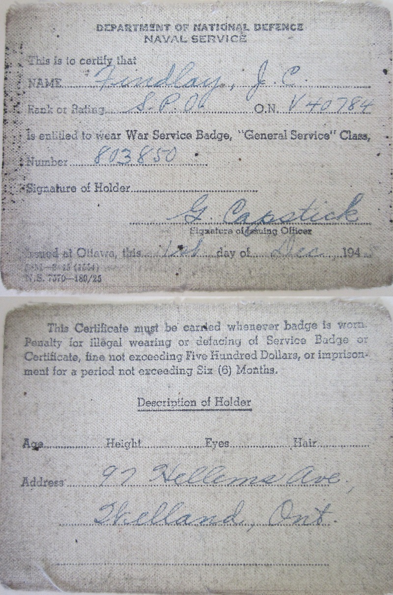 (1) James Finlay on unknown ship - possibly HMCS Whitethroat (2) Unknown Corvette (3) Unknown Minesweeper (4) James Finlay and his fiancée Elizabeth onboard a corvette (likely HMCS Fredericton) - 1942 (5) James Finlay (right) with unidentified sailor (6) Certificate of Discharge (7) Certificate - War Service Badge