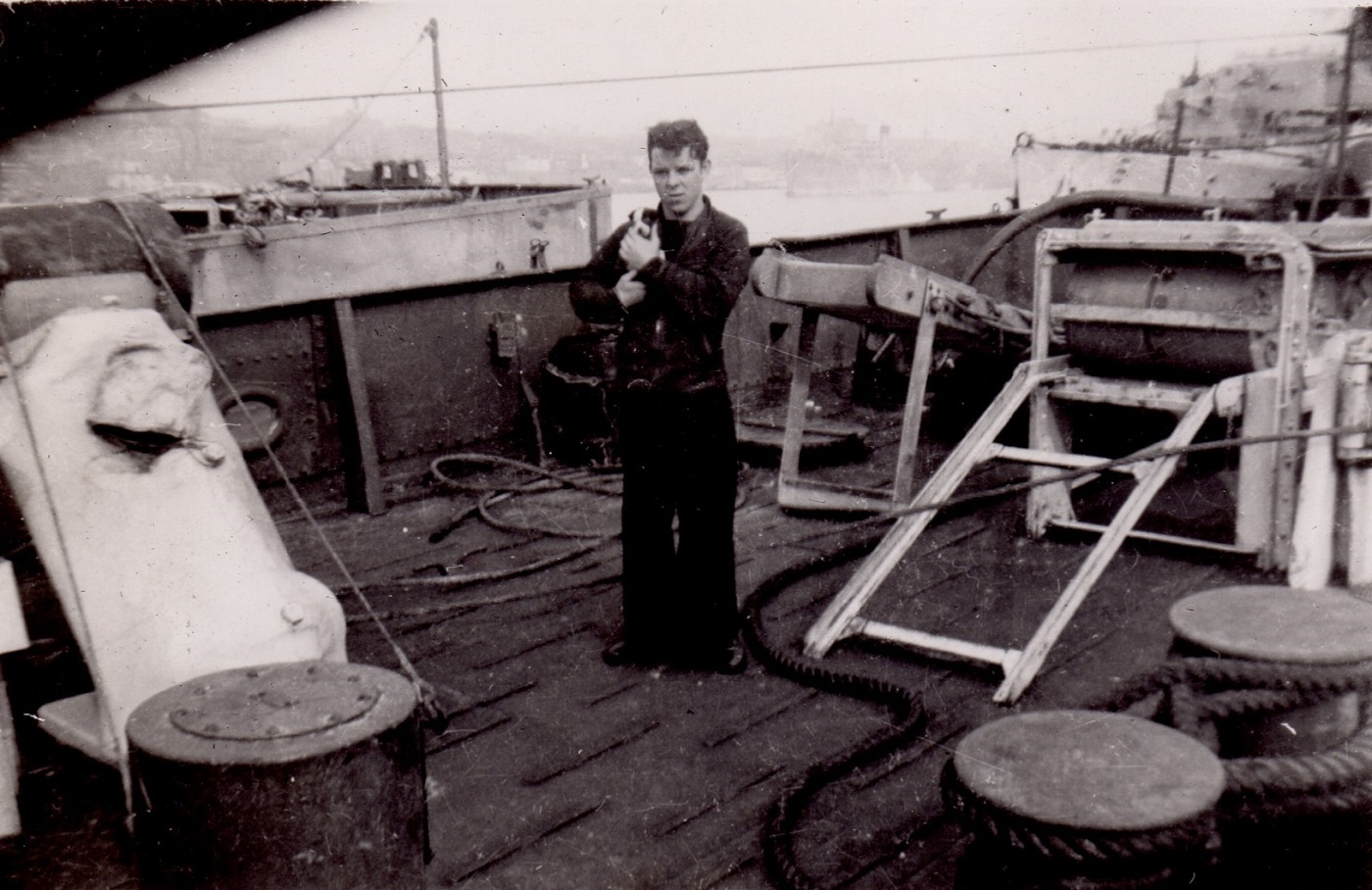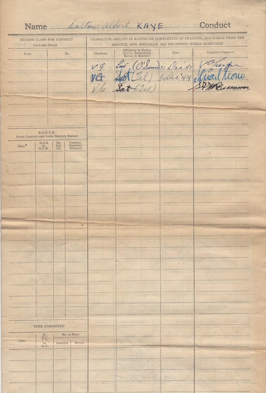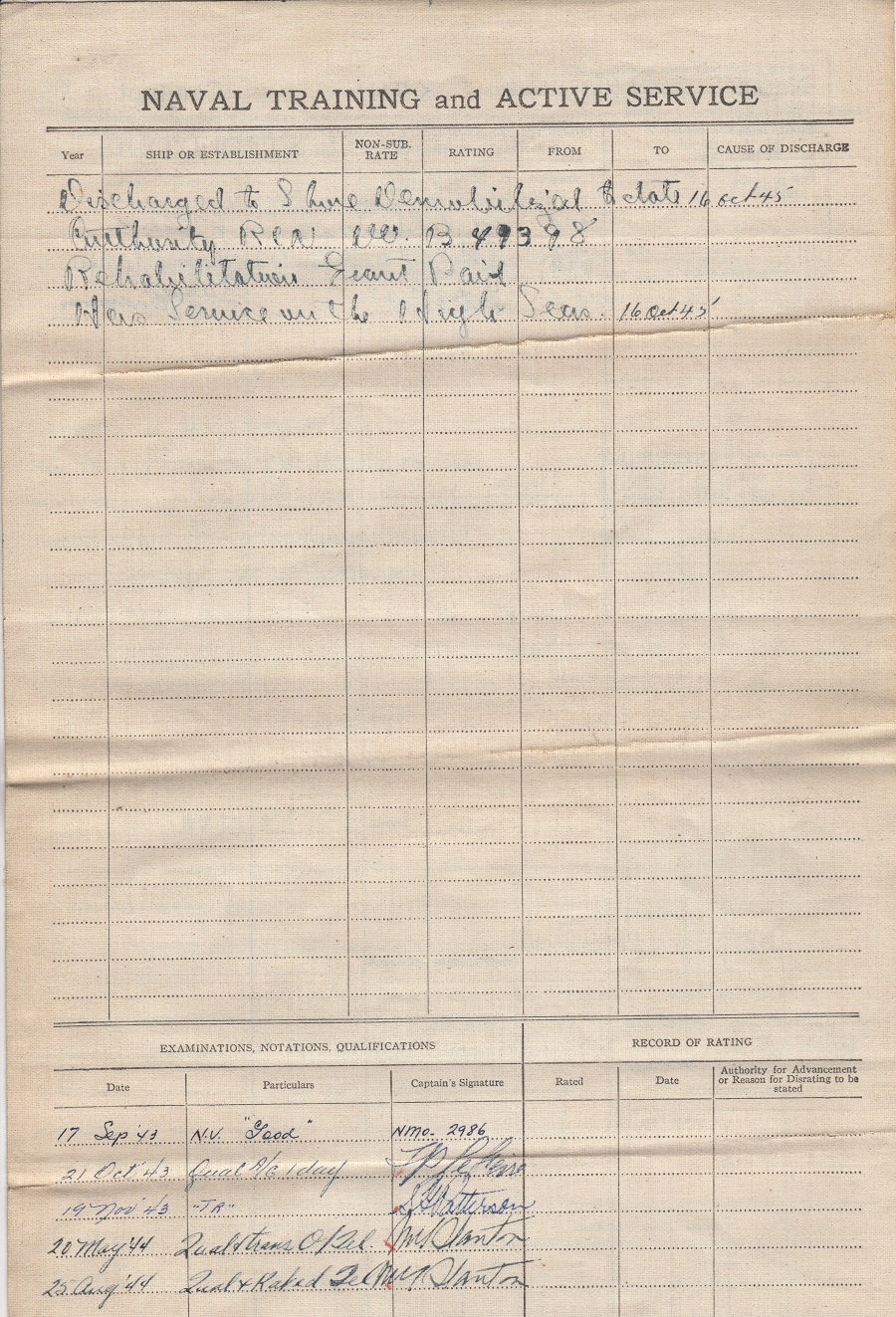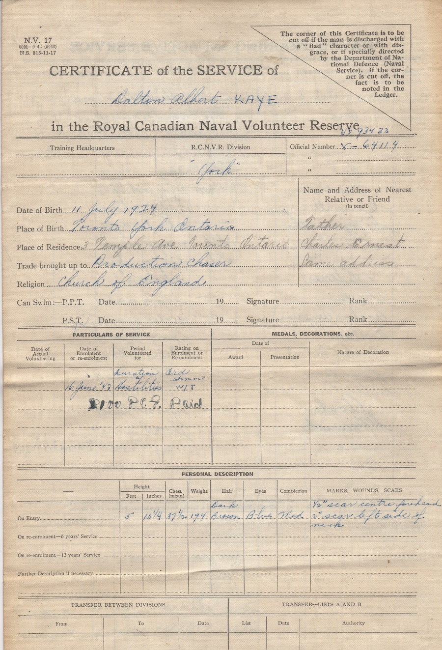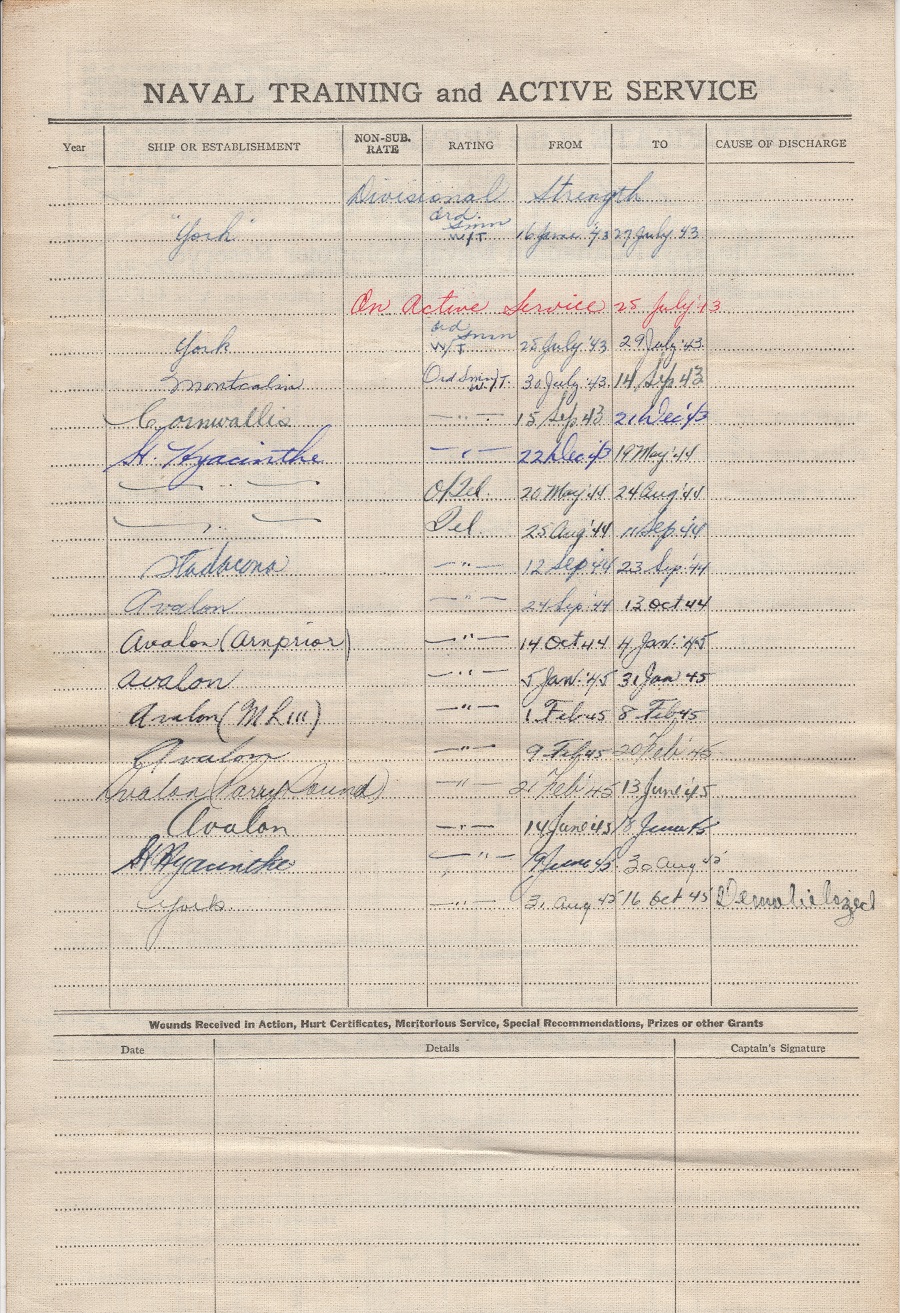 Ships served in: HMCS YORK - Enlisted 16 Jan 1943. Active service 25 Jul 1943 HMCS MONTCALM - 30 Jul 1943 - 14 Sep 1943 HMCS ARNPRIOR - Serve in Arnprior 14 Oct 1944 - 04 Jan 1945 as a Tel, RCNVR ML Q111 - Served in Q111 01 Feb 1945 - 08 Feb 1945 as a Tel, RCNVR HMCS PARRY SOUND - Served in Parry Sound 21 Feb 1945 - 13 Jun 1945 as a Tel, RCNVR HMCS YORK - 31Aug 1945. Demobilized 16 Oct 1945