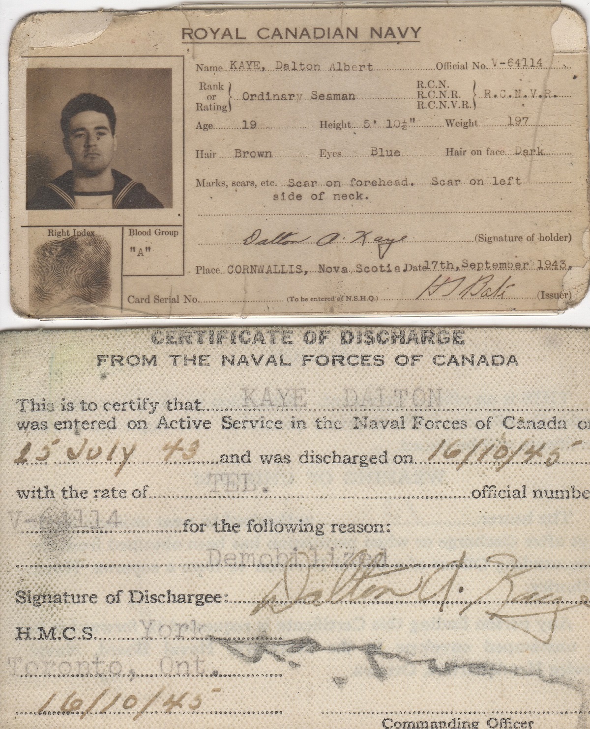 (1) Portrait of Seaman Kaye (2-5) Certificate of Service (6) Dalton's ID card (7-8) Tel Kaye onboard ship (either Arnprior or Parry Sound)