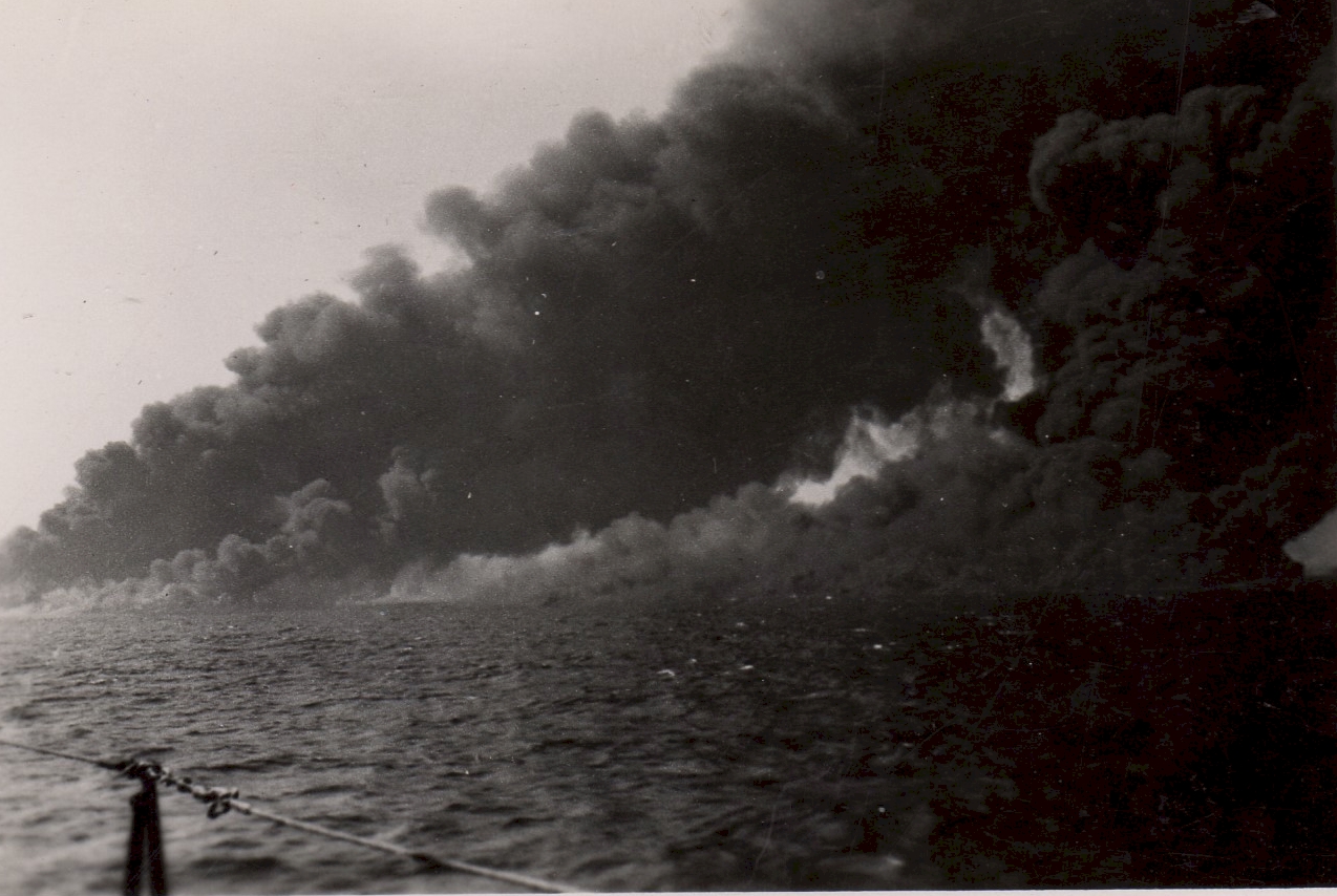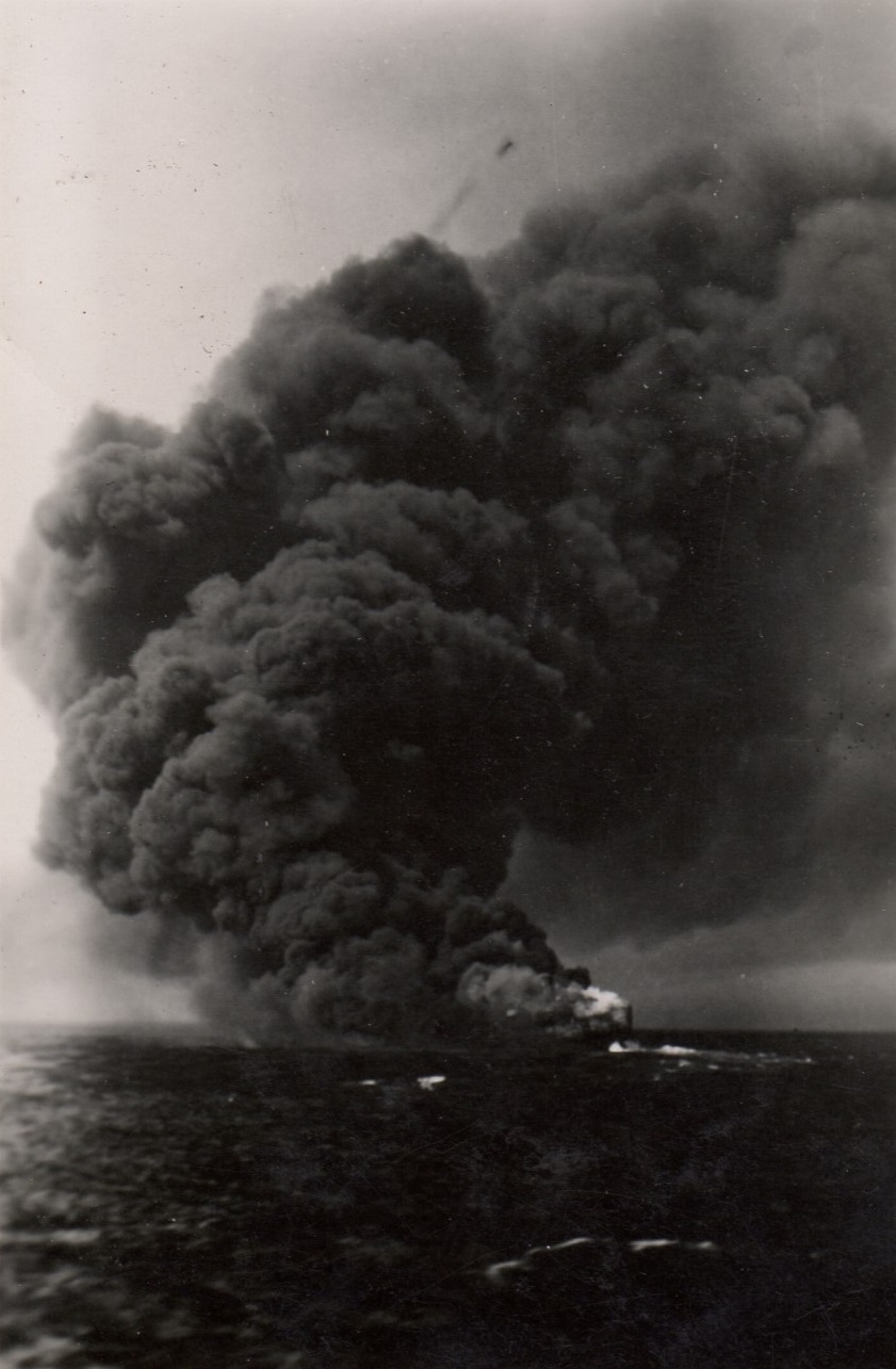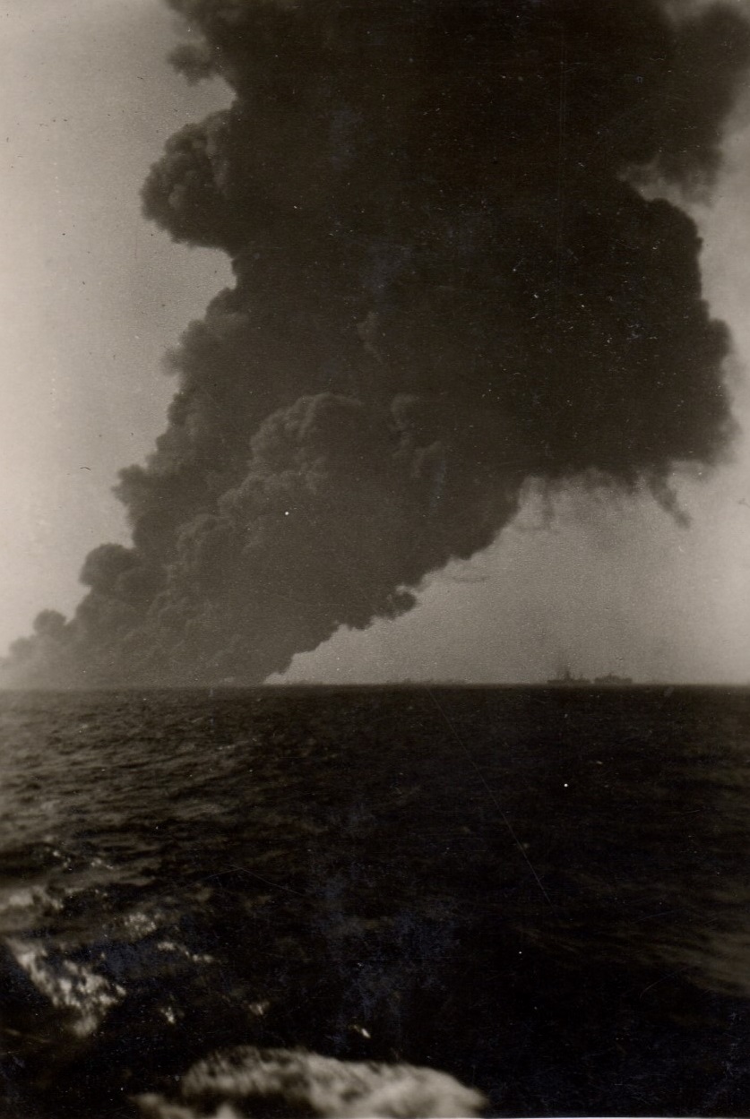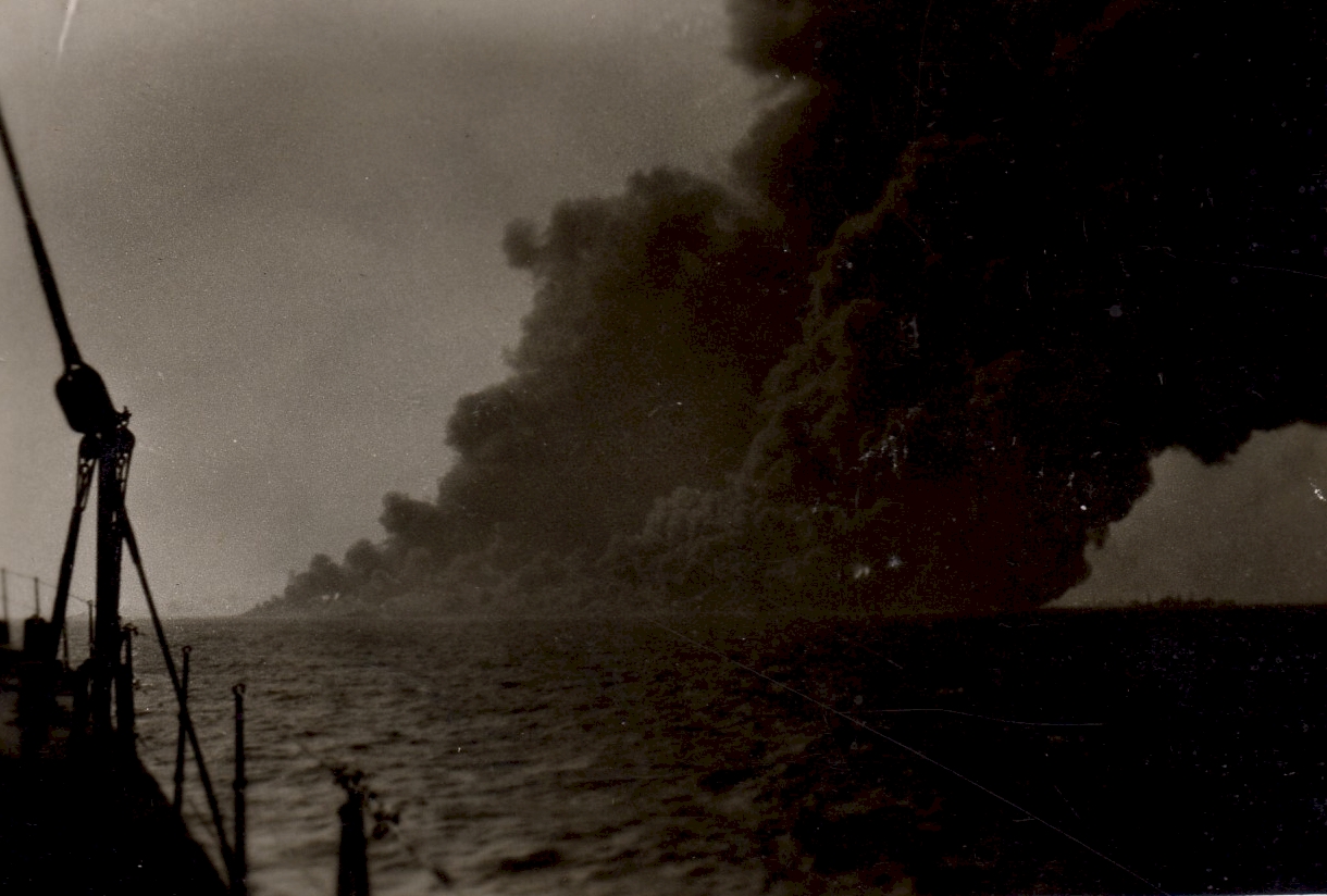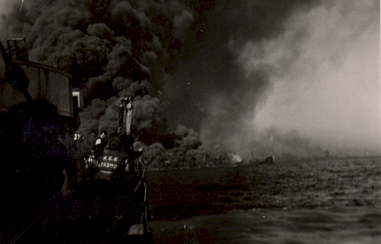Torpedoed tanker burning and sinking - believed to be the tanker EMPIRE GOLD In some of the photos you can see the convoy ships in the background. (53) - Designated convoy rescue ship searching for survivors These photos were also posted on the page for HMCS Parry Sound as she was a convoy escort for HX.348