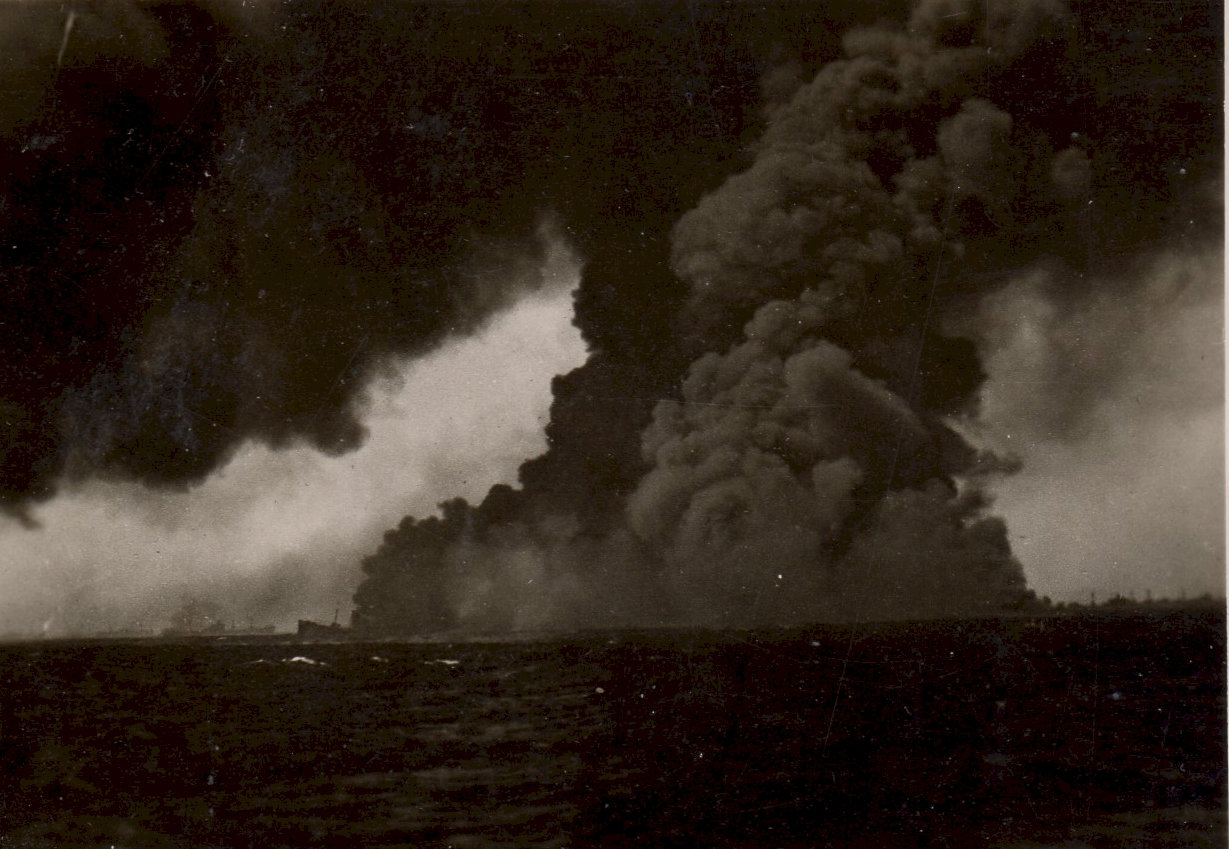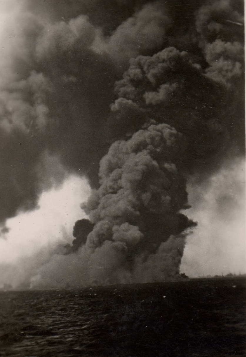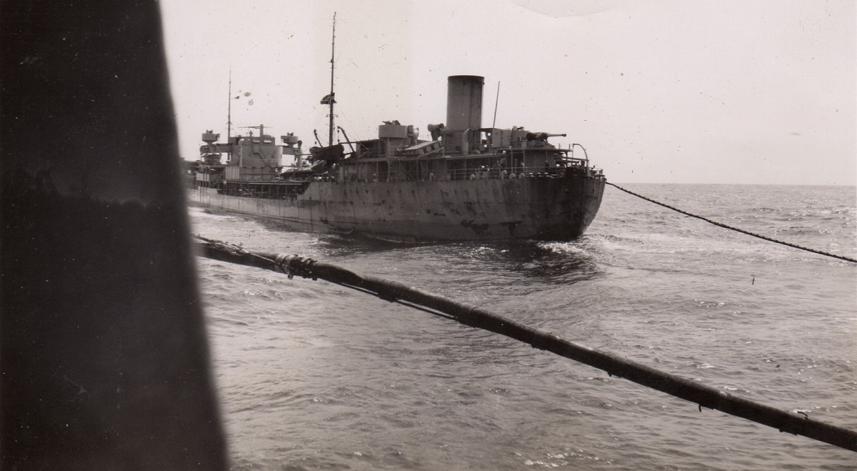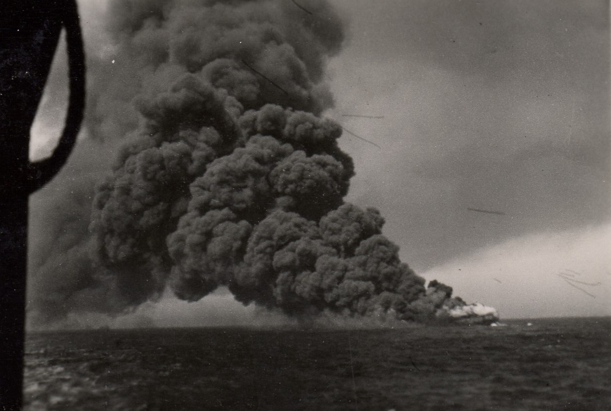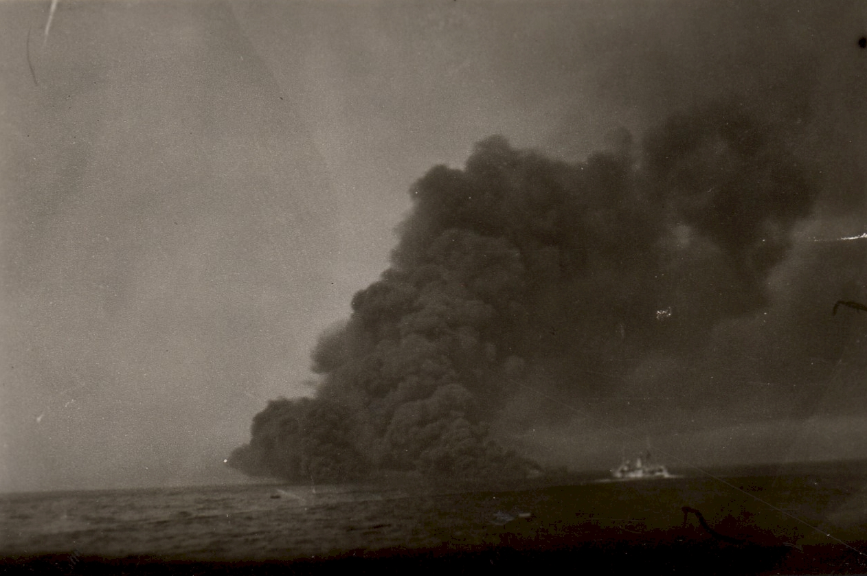 Torpedoed tanker burning and sinking - believed to be the tanker EMPIRE GOLD In some of the photos you can see the convoy ships in the background. (53) - Designated convoy rescue ship searching for survivors These photos were also posted on the page for HMCS Parry Sound as she was a convoy escort for HX.348