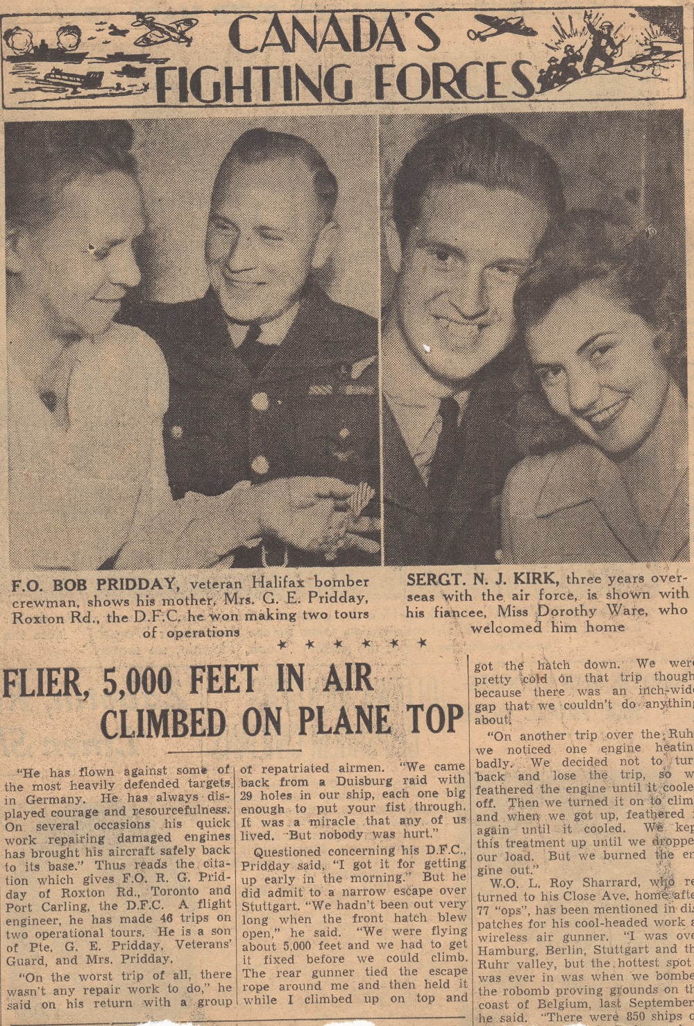 (60) Unknown corvette (61) Conducting a stern fueling (62) Article on the battleship HMS King George V (63) Unidentified airman and soldier (64-65) Newspaper articles on FO Robert Pridday receiving the DFC (66) Robert Pridday, 1st on right (67) Robert Pridday, 2nd from right