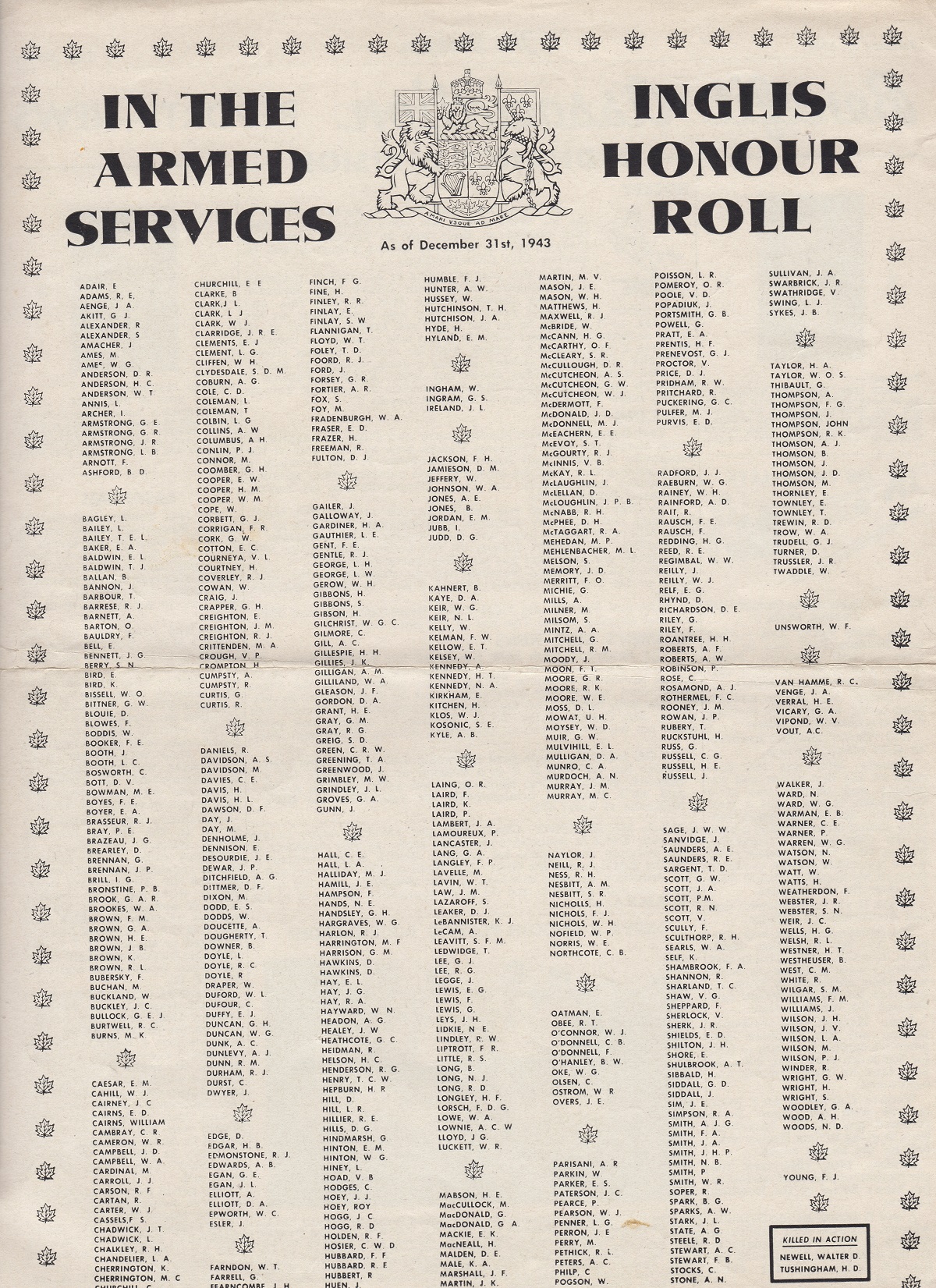 (68) Inglis Ontario Roll of Honour listing those who served (up to 31 Dec 1943) (69-70) Unknown event likely post war.