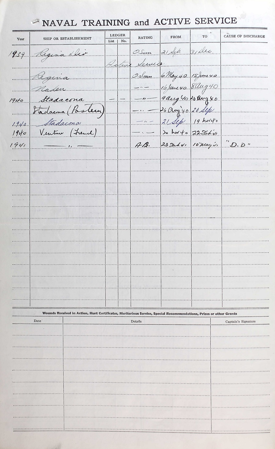 Ships served in: REGINA DIVISION RCNVR - Enlisted 21 Sep 1939. Active service 06 May 1940 PASTEUR (Troopship) - Served in Pasteur 26 Aug 1940 - 20 Sep 1940 as an OS, RCNVR HMCS FRENCH - Drafted to French 20 Nov 1940 as an OS, RCNVR. Rated AB 23 Feb 1941.
