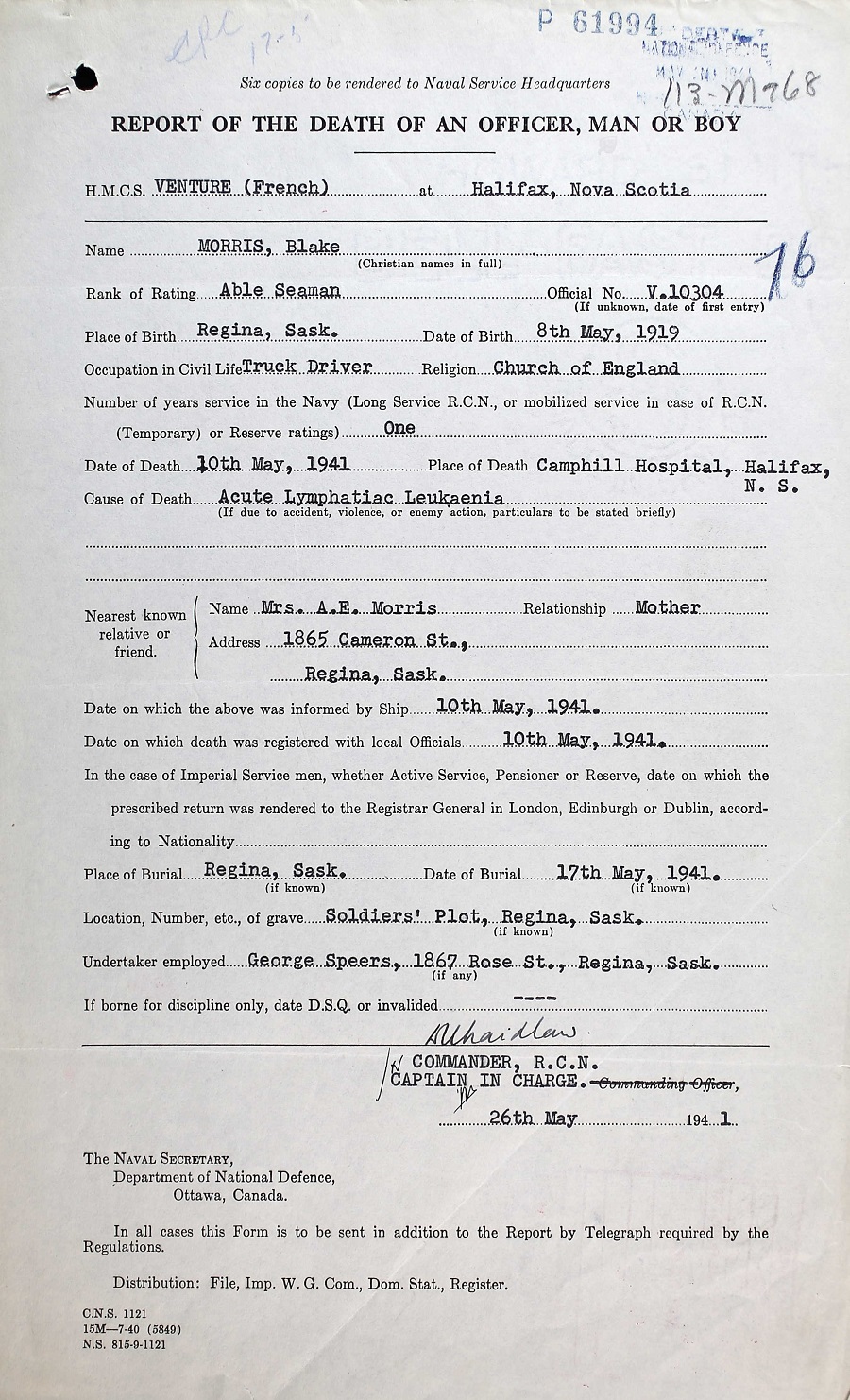 MORRIS, Blake Able Seaman, V10304, RCNVR died - 10 May 1941, HMCS FRENCH - son of Albert Edwin and Beatrice Morris of Regina, SK.