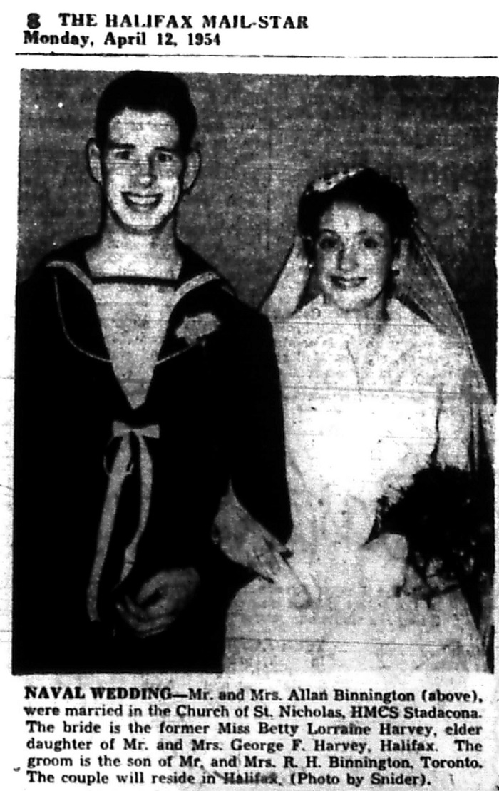 Wedding announcement for Allan and Betty Lorraine (née Harvey) Binnington The Halifax Mail-Star, 12 Apr 1954 Courtesy of / Research by George Newbury