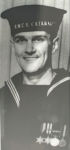 BROWN, Douglas Martyn - enlisted at HMCS Carleton, formerly known as the Ottawa Division of the RCNVR, before finishing his studies at Arnprior High School in Arnprior, Ontario. He travelled to Kingston for basic training and when completed he was sent to HMCS Cornwallis in Deep Brook, Nova Scotia to begin his naval training. The training consisted of boat handling, drills, self-defense, rope work and weapons training, he was then, in his own words, “put right on a ship as an ordinary seaman.” AB Brown served in HMCS MEON, a River-Class frigate that was a convoy escort in the Battle of the Atlantic, participated in Operation Neptune and was also present at the Allied Invasion of Normandy. Promoted to Able Seaman, he was the # 7 Gunner on the 4-inch gun and while on duty he would be alert for aircraft attacks. He wrote letters home every day, kept a photograph of his sweetheart Helen with him at all times and had his arm tattooed with her name in bold blue ink. When he returned to Canada, Doug and Helen married, had 14 children together and celebrated their 65th wedding anniversary. (Source: Arnprior & District Museum facebook page)