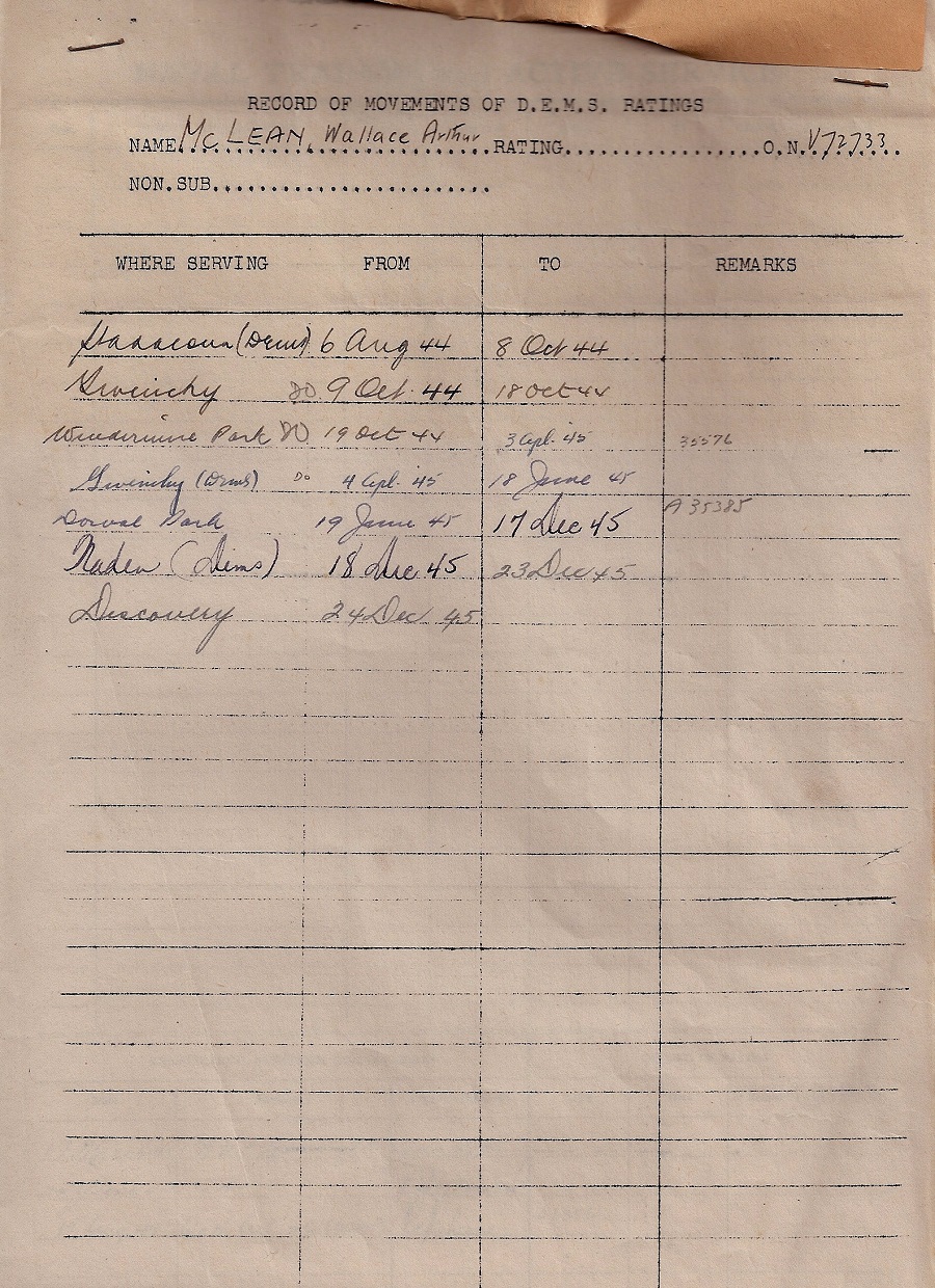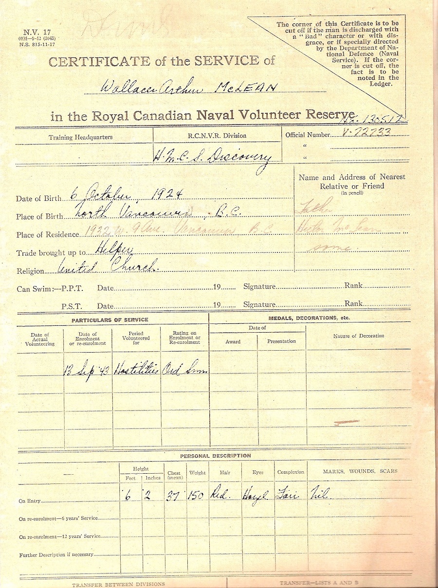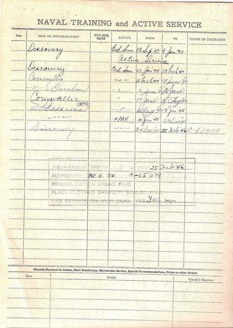 Ships served in: HMCS DISCOVERY - Enlisted: 13 Sep 1943. Commenced active service: 10 Jan 1944 HMCS CARIBOU - Served in Caribou 10-16 Jun 1944 while in training at HMCS Cornwallis SS WINDERMERE PARK (DEMS) - Served in Windermere Park 19 Oct 1944 - 03 Apr 1945 SS DORVAL PARK (DEMS) - Served in Dorval Park 19 Jun 1945 - 17 Dec 1945 HMCS DISCOVERY - Drafted to Discover 24 Dec 1945. Demobilized 25 Feb 1946
