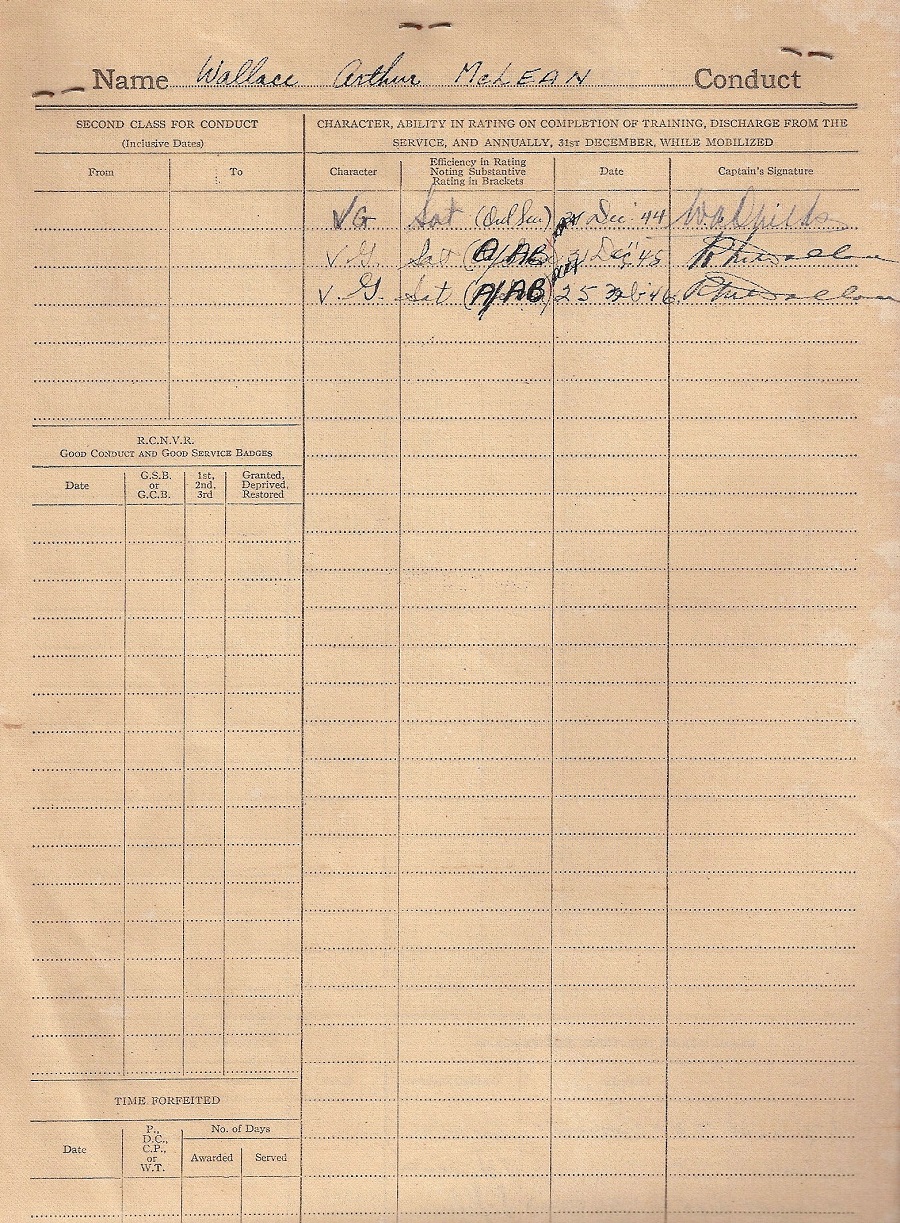 (1) Portrait of Seaman McLean (2) Certificate of Service (3) Naval Training and Active Service record (4) Record of Movements D.E.M.S. ratings (5) Record of Conduct (6) Portrait of Seaman McLean (7) Wally McLean and Vera Shore McLean