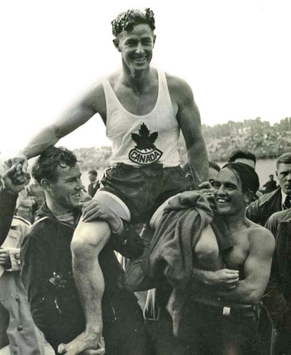 AMYOT Francis (Frank) - He was a Canadian sprint canoer who competed in the 1930s. Born in Thornhill, Ontario, he won Canada's only gold medal at the 1936 Summer Olympics in the C-1 1000m canoeing events. This proved embarrassing to Canadian officials who had refused to pay his way. In 1936, Britannia Boating Club raised money for Frank Amyot's Olympic Fund campaign. When he won the 1000 meter championship in the 1936 Olympic Games, Frank Amyot of BYC raced the Canadian canoe, which is different from the type of canoe he had raced in Canadian Canoe Association meets. Although he had seen blueprints, Amyot rowed the Canadian canoe for the first time during the final training stages in Germany. On June 18, 1933 Amyot saved Ottawa Rough Riders Dave Sprague and Eddie Bond from drowning, when their canoe overturned on Lake Deschenes. On July 18, 1942, Lieutenant Frank Amyot attended a meeting of 17 Britannia Boating Club members, in army and civilian war jobs during World War II, at Holborn Restaurant in London, England. Amyot was inducted into the Canadian Olympic Hall of Fame in 1949 and Canada's Sports Hall of Fame in 1955. In 1964, the Britannia Yacht Club presented the Frank Amyot Memorial Trophy awarded to Junior Men C-15 Canoe Kayak Canada Canadian Sprint Canoe Kayak Championships, in loving memory of Frank Amyot, a life member of the club, Olympic Single Blade Singles C-1 Gold Medallist (1936), and distinguished member of Canada's Sports Hall of Fame. In 2012, the Britannia Yacht Club stairwell featured a display with a photo of Frank Amyot and a collection of his trophies. (Source: Find-a-Grave)