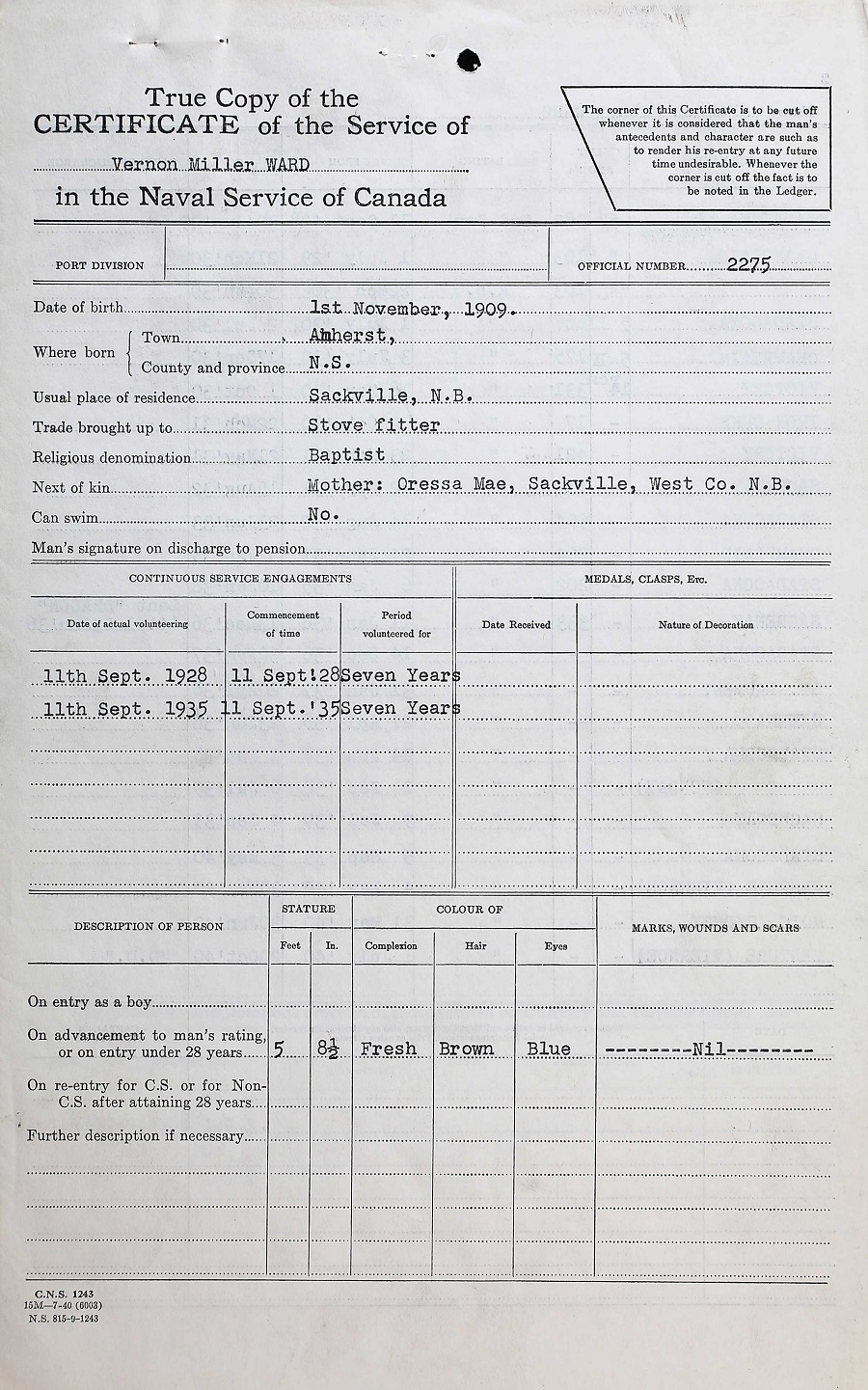 Vernon Miller Ward latterly of Sackville, New Brunswick was born at Amherst, Nova Scotia, on November 01, 1909. He was educated at the public school of Amherst and Sackville, and later (1925-26) at Mount Allison Academy. Able Seaman Ward's death, which occurred while on leave, was reported on October 25, 1940. He had seen long service, joining the R.C.N. at Halifax on September 11, 1928. He is survived by his mother, Mrs. Melbourne Ward of Sackville, New Brunswick.
