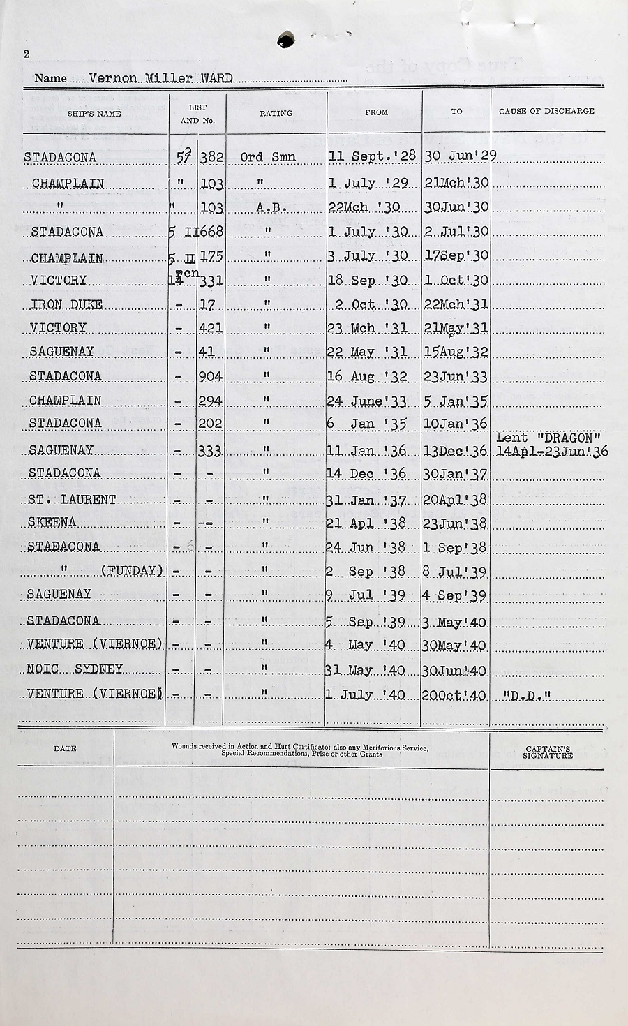 Ships served in: HMCS CHAMPLAIN - Served in CHAMPLAIN 01 Jul 1929 - 30 Jun 1930 as an OS and AB, RCN. Rated AB 22 Mar 1930 HMCS CHAMPLAIN -Served in CHAMPLAIN 03 Jul 1930 - 17 Sep 1930 as an AB, RCN HMS IRON DUKE - Served in IRON DUKE 02 Oct 1930 - 22 Mar 1931, as an AB, RCN HMCS SAGUENAY - Served in SAGUENAY 22 May 1931 - 15 Aug 1932 as an AB, RCN HMCS CHAMPLAIN -Served in CHAMPLAIN 24 Jun 1933 - 05 Jan 1935 as an AB, RCN HMCS SAGUENAY - Served in SAGUENAY 11 Jan 1936 - 13 Dec 1936 as an AB, RCN HMS DRAGON - Served in Dragon 14 Apr 1936 - 23 Jun 1936 (lent from HMCS SAGUENAY) HMCS ST LAURENT - Served in ST LAURENT 31 Jan 1937 - 20 Apr 1938 as an AB, RCN HMCS SKEENA - Served in SKEENA 21 Apr 1938 - 23 Jun 1938 as an AB, RCN HMCS FUNDY - Served in FUNDY 02 Sep 1938 - 08 Jul 1939 as an AB, RCN HMCS SAGUENAY - Served in SAGUENAY 09 Jul 1939 - 04 Sep 1939 as an AB, RCN HMCS VIERNOE -Served in VIERNOE 04 May 1940 - 30 May 1940 as an AB, RCN HMCS VIERNOE - Drafted to VIERNOE 01 Jul 1940 as an AB, RCN