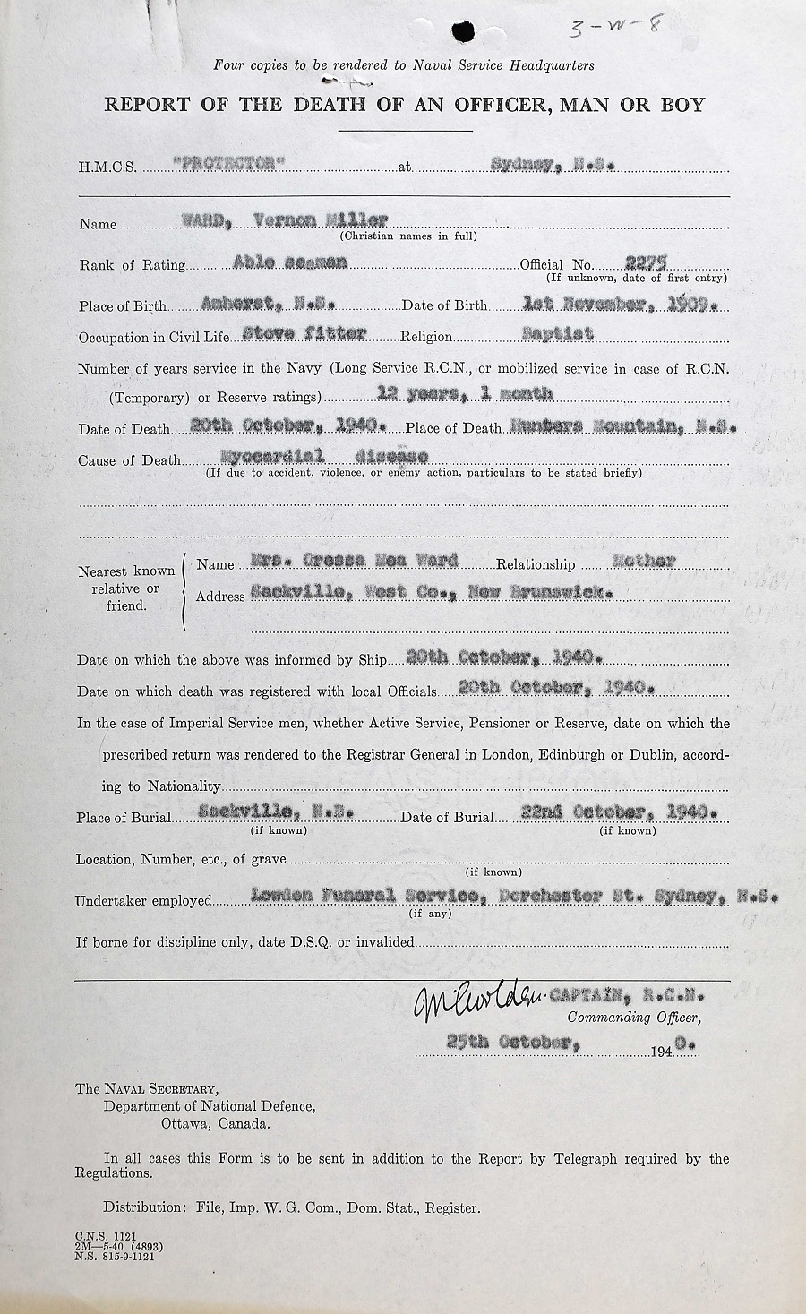 WARD, Vernon Miller, AB, 2275, RCN, died - 20 Oct 1940, HMCS VIERNOE - Born 01 Nov 1909. Able Seaman V. M. Ward died when on leave at Hunters Mountain, Victoria County, Cape Breton, NS. He suffered a massive heart attack and death was almost instantaneous.