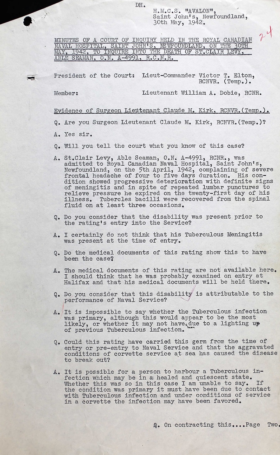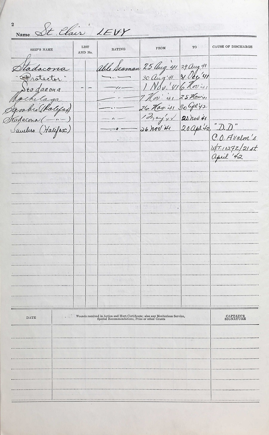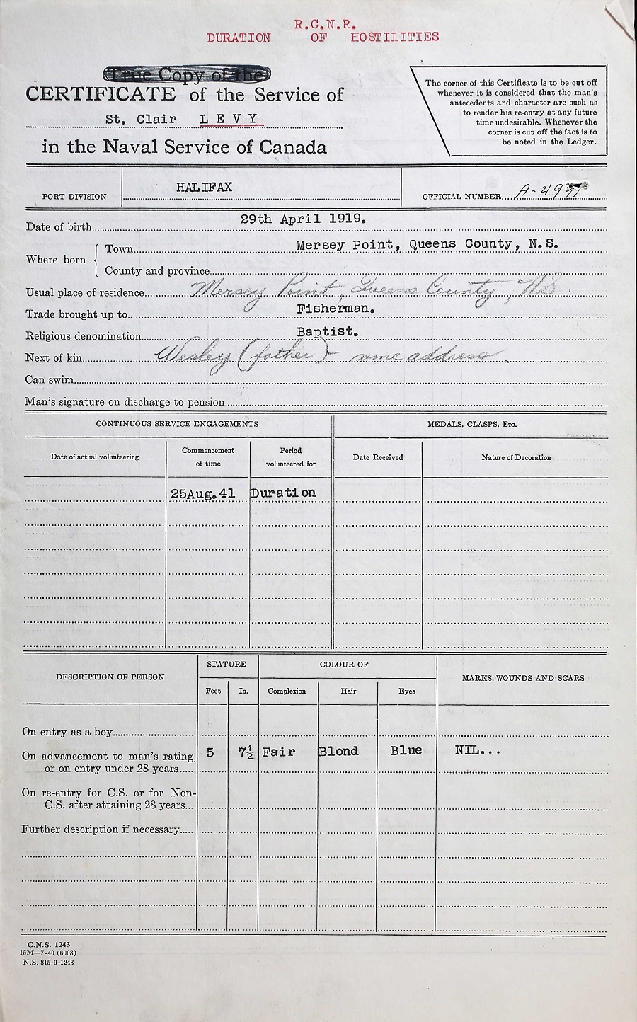 LEVY, St Clair AB, A/4991, RCNR died - 20 Apr 1942, HMCS HALIFAX / RCN Hospital, St. John's, Newfoundland - son of Wesley and Nora Levy of Mersey Point, NS.