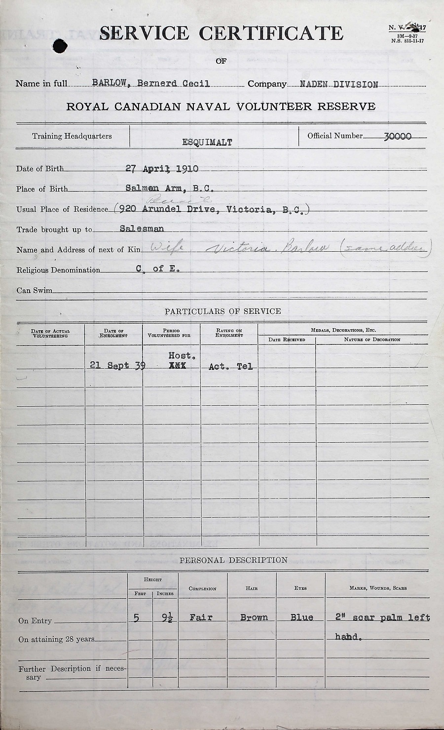 BARLOW, Bernard Cecil, Tel, V30000, RCNVR, died - 03 Jul 1940, LEOLA VIVIAN - son of Claude and Christine Barlow, of Salmon Arm, BC; husband of Victoria Rosita Barlow, of Victoria, BC.