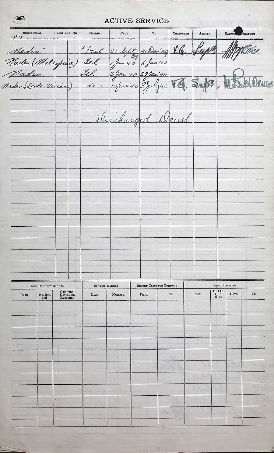 Ships served in: HMCS MALASPINA - Served in MALASPINA 01-02 Jan 1940 as a Tel, RCNVR Fisherman's Reserve Vessel LEOLA VIVIAN - Drafted to LEOLA VIVIAN 30 Jan 1940 as a Tel, RCNVR