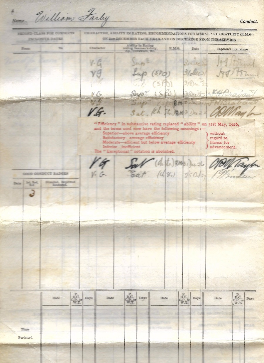 William Farley served in the Royal Navy (#K5760) during WW1 and attained the rate of CPO.SM. He transferred to the RCN on 26 Oct 1920 as a Stoker 1st class. He was honourable released 25 Oct 1927 when his engagement expired.