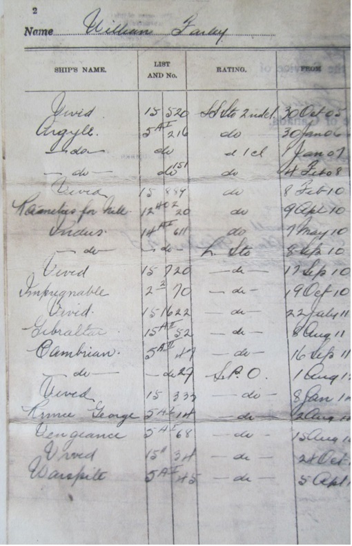 Ships served in: (Royal Navy) HMS VIVID- shore establishment HMS ARGYLLE - Devonshire Class Armoured Cruiser HMS