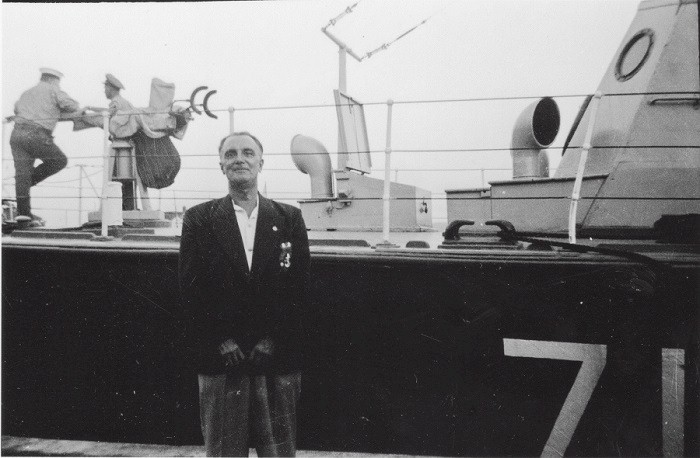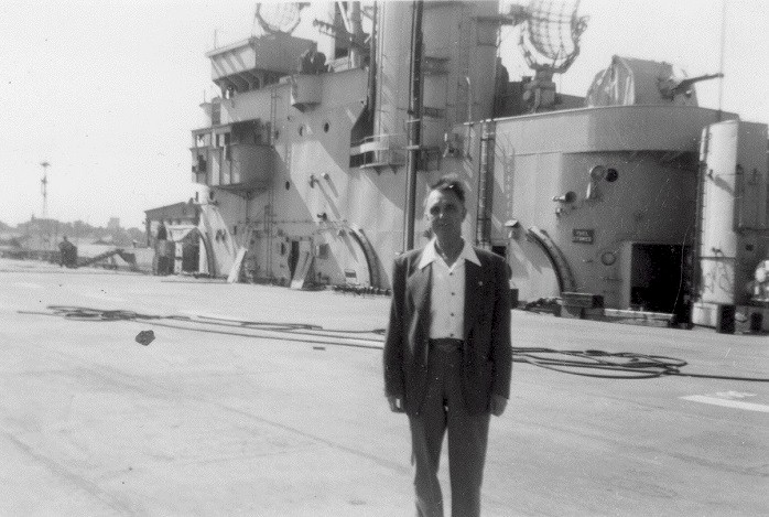 (1) William Cardy's WW1 medals (2-3) HMS Euryalis (4) William Dennis Cardy in front of HMCS Reindeer 716 alongside HMCS York, Toronto, circa 1952-53 (5) William Dennis Cardy on the flight deck of HMCS Magnificent