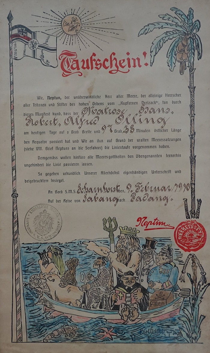 Crossing the line certificate (Equator) for Hans Robert Alfred Olling onboard the German Armoured Cruiser SMS Scharnhorst - 09 Feb 1910