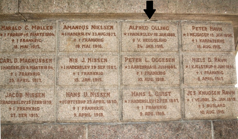 Photo of monument in the hometown of Alfred Olling Close up of Alfred's name on monument