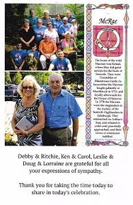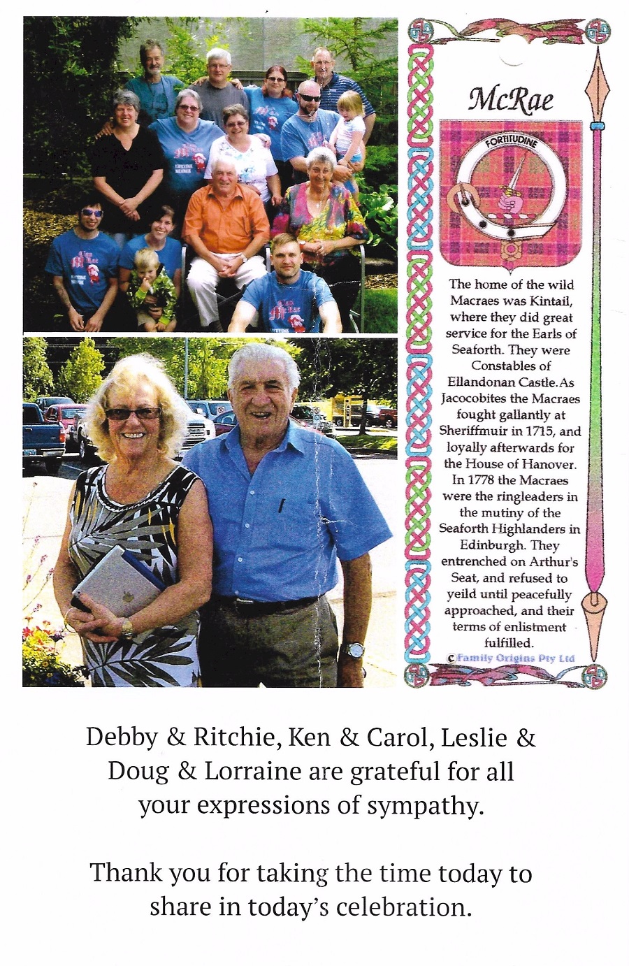 McRAE, Allan Richard - passed away on July 24, 2019, at the age of 89 years, after a short battle with cancer. Allan was born in Wishart, Saskatchewan on August 12, 1929. He served in the Royal Canadian Navy for 27 years, and retired with the rank of Lieutenant-Commander as the Executive Officer of Fleet Diving Unit (Pacific). Allan went on to co-own RIMPAC Divers in Sidney, B.C., then ran a dive charter boat, the MV Triton, out of Victoria's Inner Harbour, taught industrial arts at Parkland School in Saanich, B.C. and worked for Supply Services Canada on the build of the science vessel John P. Tully as well as serving on board the Tully for several research voyages. Allan was predeceased by his wife, Pat, in 1995. Since 2009, Allan has been living in Fanny Bay, B.C. Since then, he has enjoyed travelling with his friend, Pat Suchy, through the Yukon, B.C., the prairies and Michigan, visiting their families and many friends. His family is grateful to Pat for her love and companionship over the past 10 years. In 2018, Allan joined a dance group in Courtenay, B.C. that kept him active and vital until April 2019. His family is grateful to his dance partner, Frankie Dougan, for her love and support in the past year. He is survived by his children, Debby (Ritchie Parkin), Ken (Carol), Leslie and Doug (Lorraine), his grandchildren, Stephanie, Duncan, David, Dan and Trish, and his great-grandchildren, Connar, Kaydance, Lynkoln and Rylie. At Allan's request, there will be no funeral service. Friends may remember Allan by a donation to the Royal Canadian Legion. A Poppy Tribute will be held at the Royal Canadian Legion Branch 17 in Courtenay on Friday, August 16 at 1400 hours (2 p.m.) (Victoria Times Colonist 02 Aug 2014)