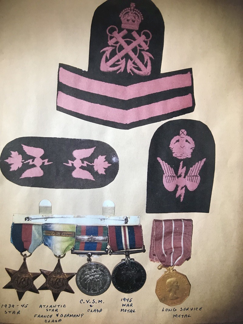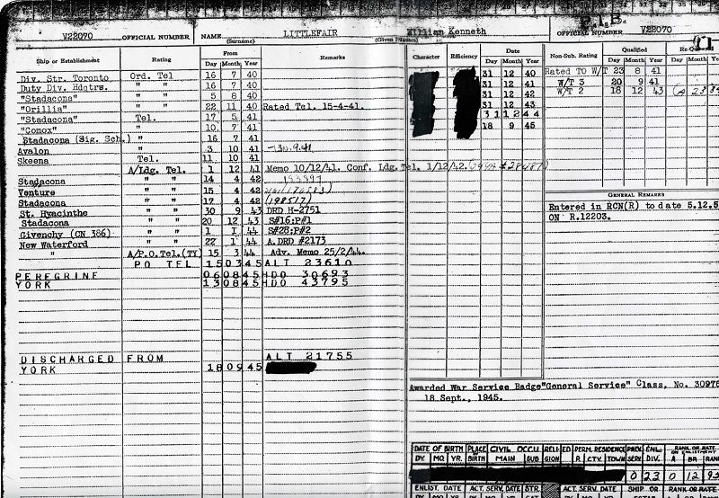 Ships served in: TORONTO DIVISION RCNVR - Enlisted 17 Jul 1940 HMCS ORILLIA - Served in Orillia 22 Nov 1940 - 16 May 1941 as a O/Tel and Tel, RCNVR. Rated Tel 15 Apr 1941 HMCS COMOX - Served in Comox 10 Jul 1941 - 15 Jul 1941 as a Tel, RCNVR HMCS ST HYACINTHE (Halifax) - Aug-Sep 1941 HMCS SKEENA - Served in Skeena 11 Oct 1941 - 13 Apr 1942 as a Tel and A/L/Tel, RCNVR NRS ALBRO LAKE - Served at NRS Albro Lake in 1943 (loaned from HMCS Stadacona) HMCS NEW WATERFORD - Served in New Waterford 22 Jan 1944 - 06 Aug 1945 as an A/PO Tel and PO Tel, RCNVR. Rated PO Tel 15 Mar 1945 HMCS YORK - Drafted to York 13 Aug 1945. Demobilized 18 Sep 1945