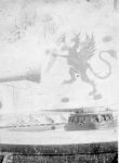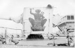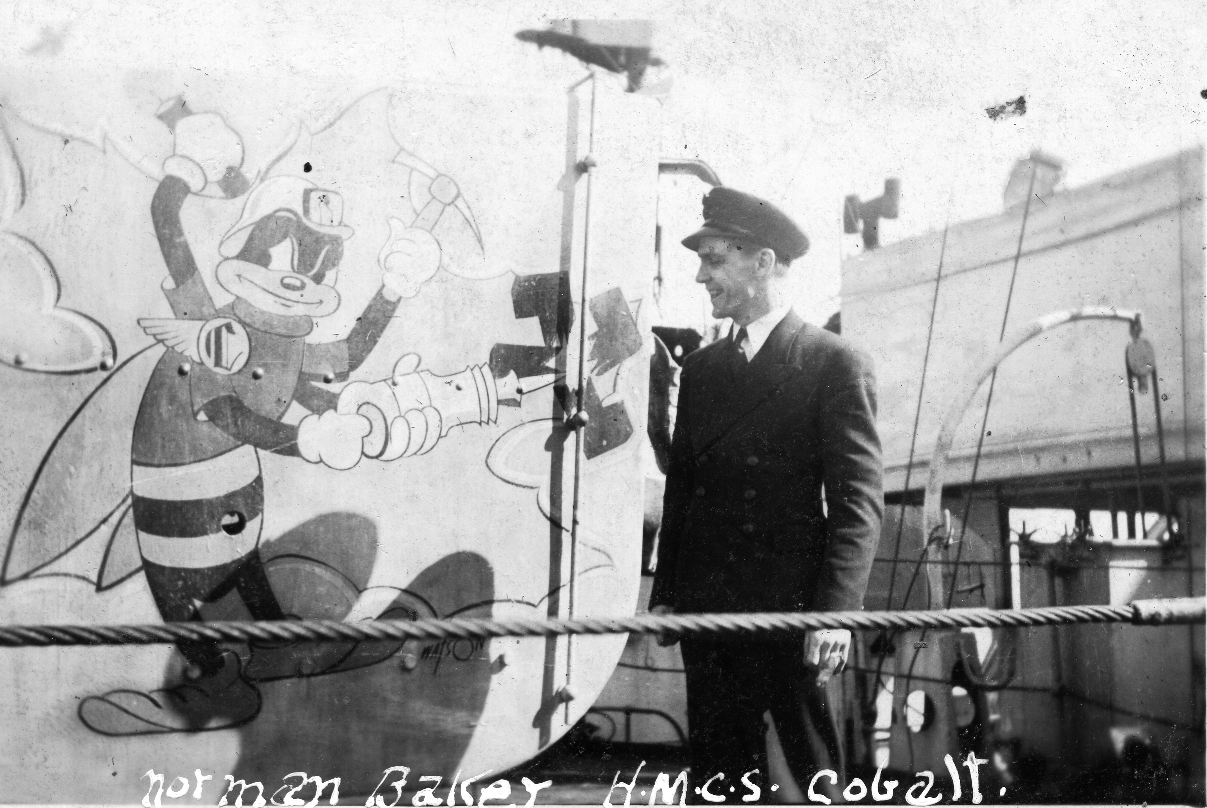 Gunshield art on various ships (RTL-REM169) HMCS SOREL'S gunshield art on her 4-inch gun depicting a horse eating a U-boat. The photo was taken in St. John's Nfld in 1943 (RTL-REM170) HMCS MORDEN'S gunshield art on her 4-inch gun depicting a bald eagle swooping down on the sea towards a periscope with outstretched talons. The photo was taken in St. John's Nfld in 1943 (RTL-REM171) HMCS PICTOU'S gunshield art on her 4-inch gun depicting a Griffin breaking a U-boat in two. The photo was taken in St. John's Nfld in 1943 (RTL-REM172) Norman Baker poses with the colourful gunshield art on the 4-inch gun of HMCS COBALT depicting a Bee with mining equipment breaking a swastika. The corvette is named after the town, Cobalt in Ontario, known for mining. The photo was taken in St. John's Nfld in 1943 (RTL-REM173) HMCS DRUMHELLER'S gunshield art depicting the devil beating on a fiery drum. The photo was taken in St. John's Nfld in 1943