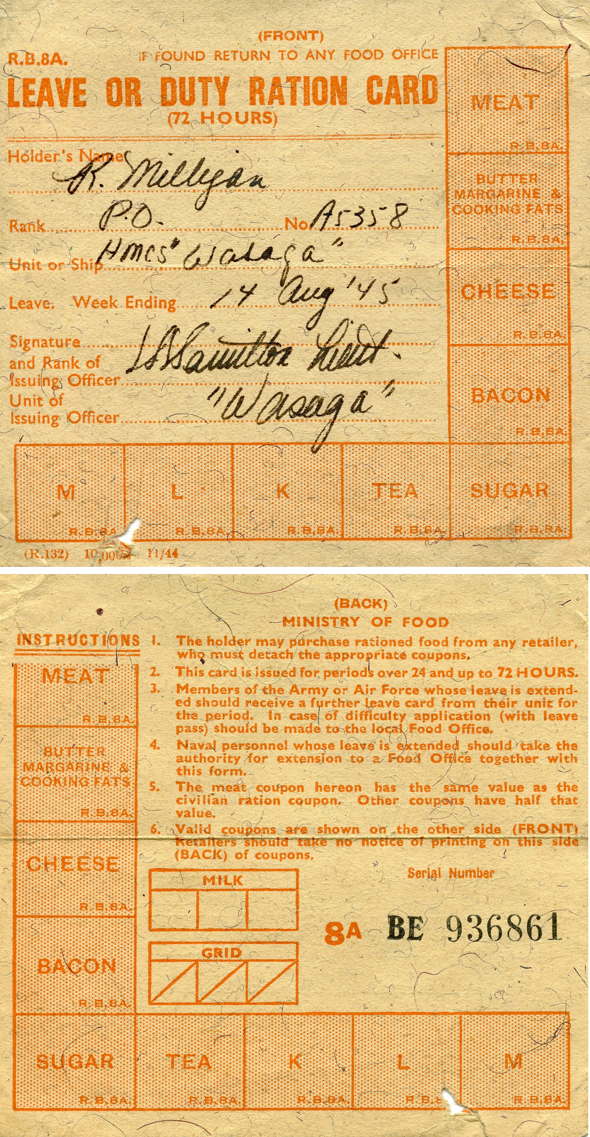 (RTL-REM014) LS Ross Milligan in Halifax, NS in 1942 (RTL-REM016) LS Ross Milligan Dartmouth, NS in 1942 (RTL-REM135) 10 French Francs (RTL-REM136) Leave or Duty Ration Cardfor PO Ross Milligan