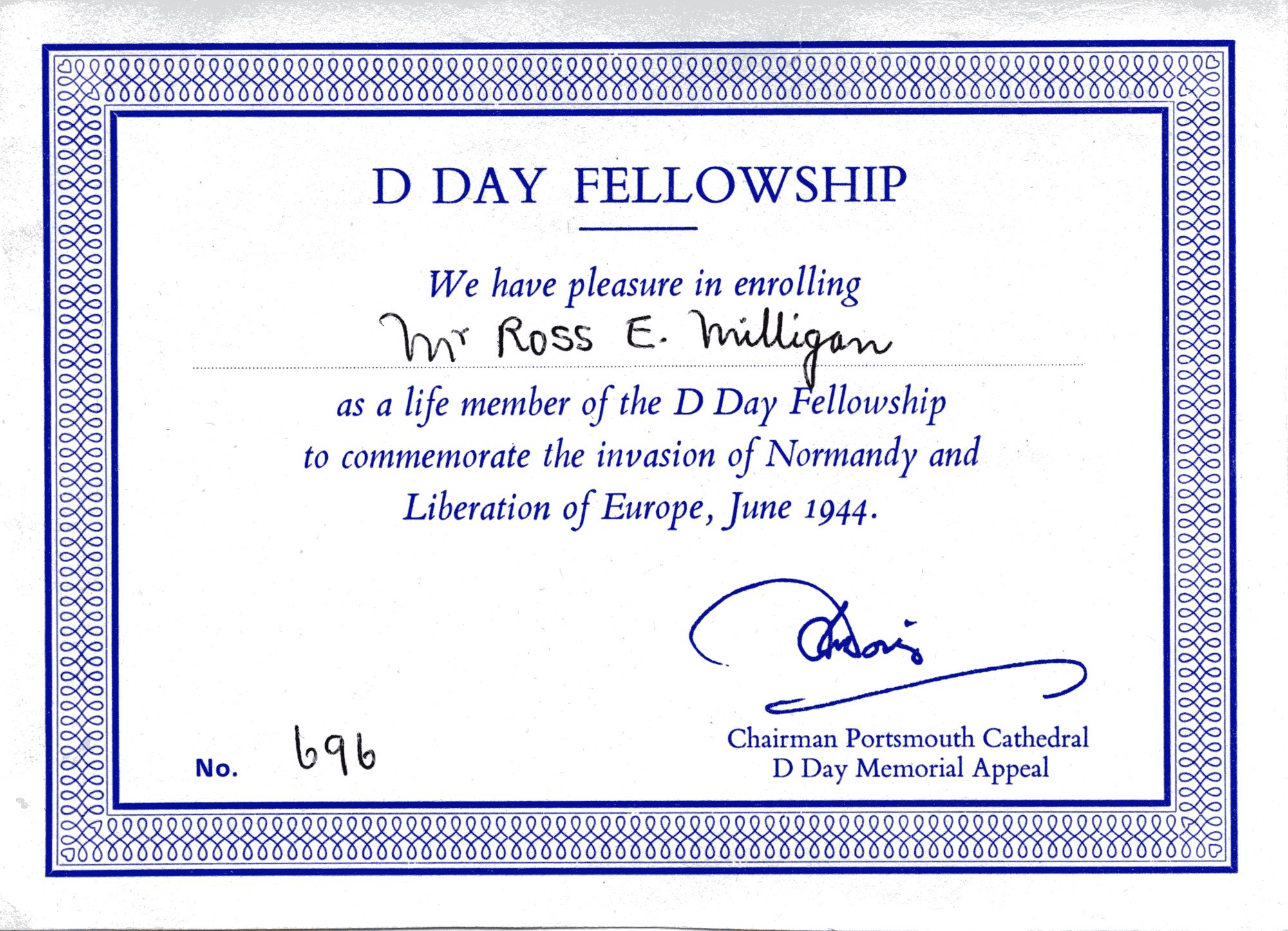 (RM01) Service Documents from Ross Milligan (RM02 / RTL-REM325) HMCS WASAGA jacket patch (RM03 / RTL-REM326) D-Day fellowship certificate