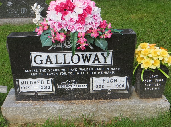 Hugh is listed in the Next of Kin (NOK) list for HMCS Wasaga for 15 Apr 1945. His NOK was his wife, Mrs. Mildred E. Galloway, 270 Britain St., St. John, NB. Hugh and his wife are buried in the Woodstock Rural Cemetery, Woodstock, NB.