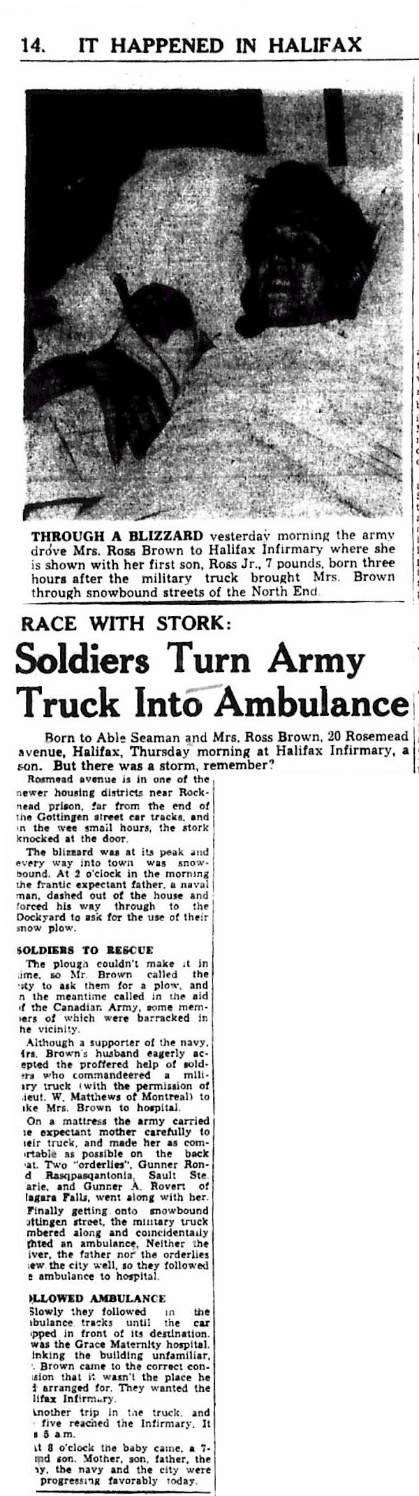 (Below) - Article on the birth of Ross Brown Jr., during a blizzard in Halifax.